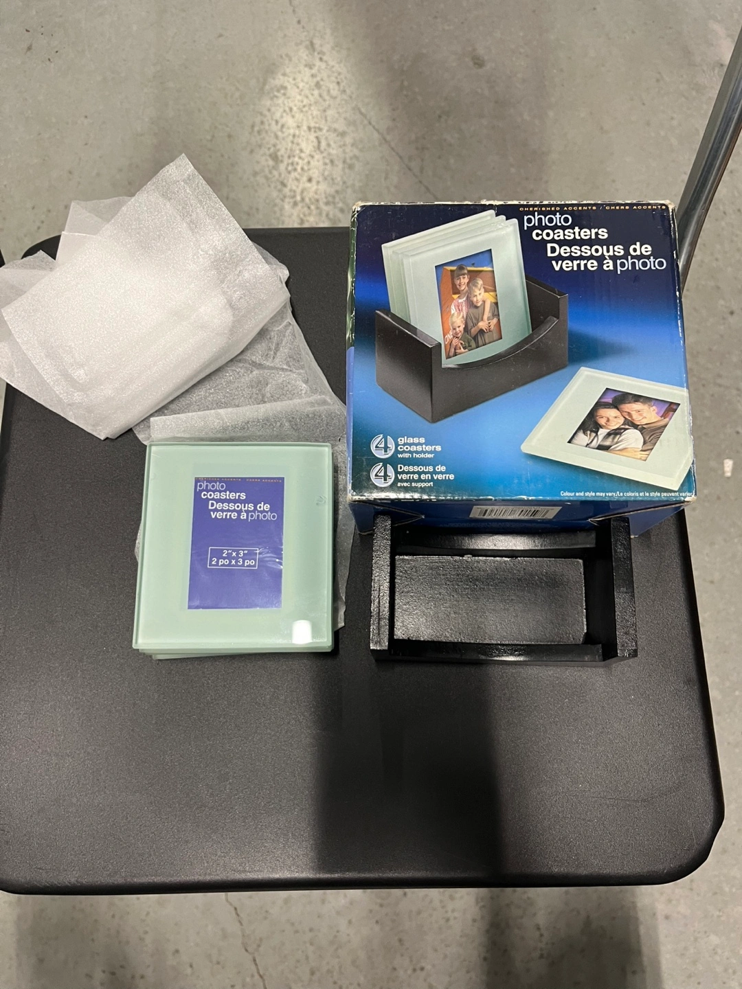 Selling a set of photo coasters. They are glass and come with a holder. Each coaster is 2" x 3". The box is included!