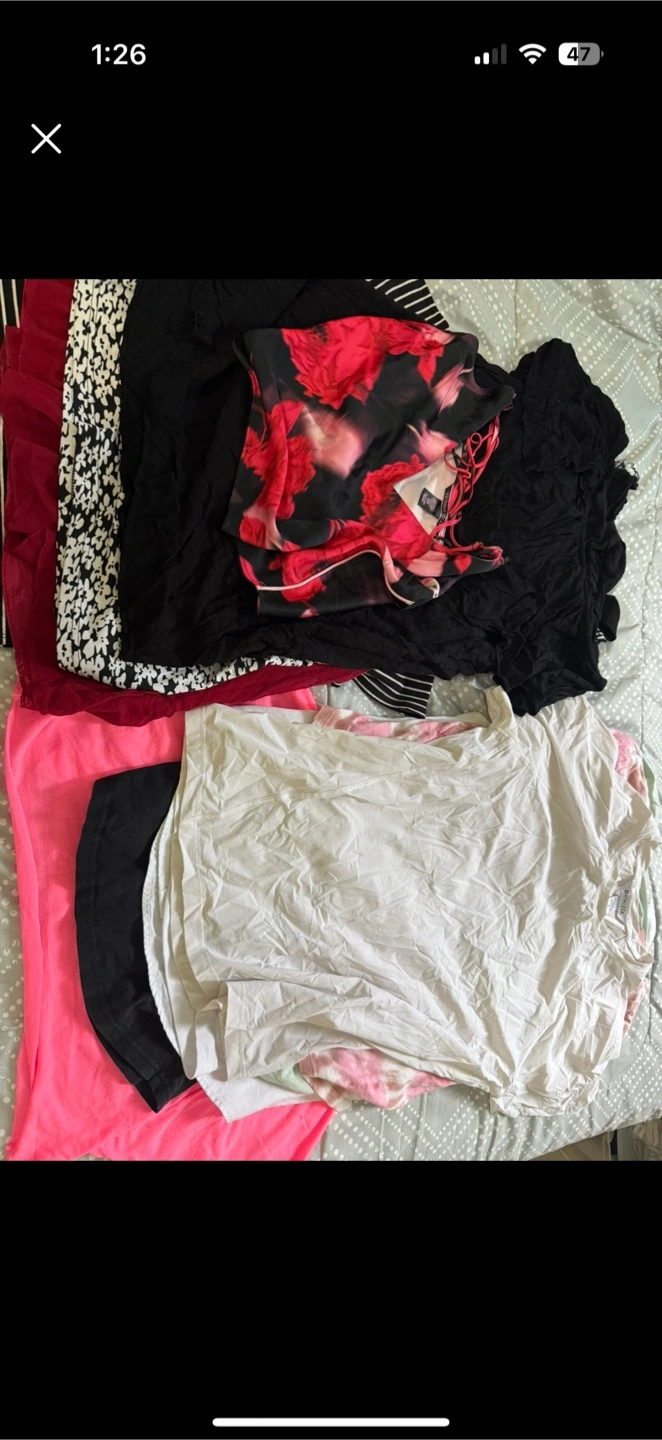 Selling a mixed lot of women's clothing. There are multiple tops and bottoms in various colours and patterns. Great for expanding your wardrobe! Some are branded. Sizes are xs-medium. No choosing of sizes. Its bundle takes it all. Good condition.