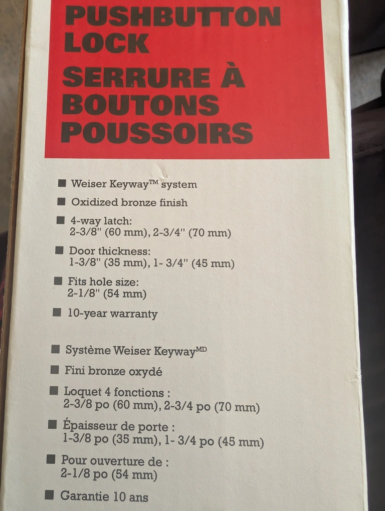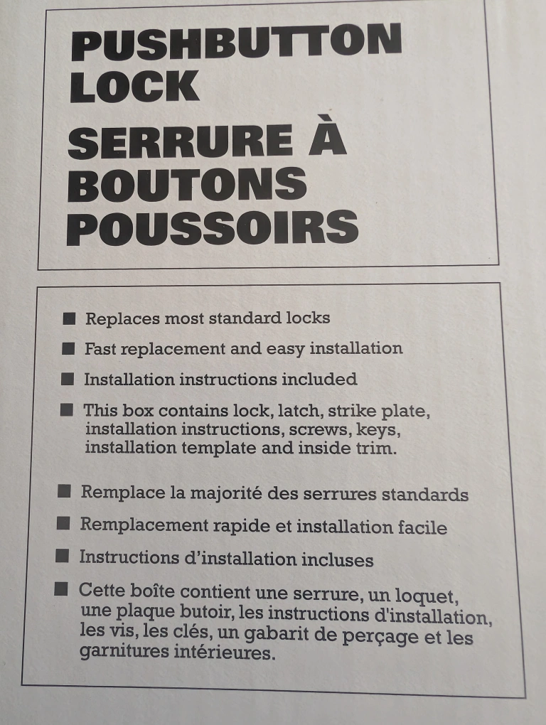 - Includes lock, latch, strike plate, installation instructions, screws, keys, installation template and inside trim