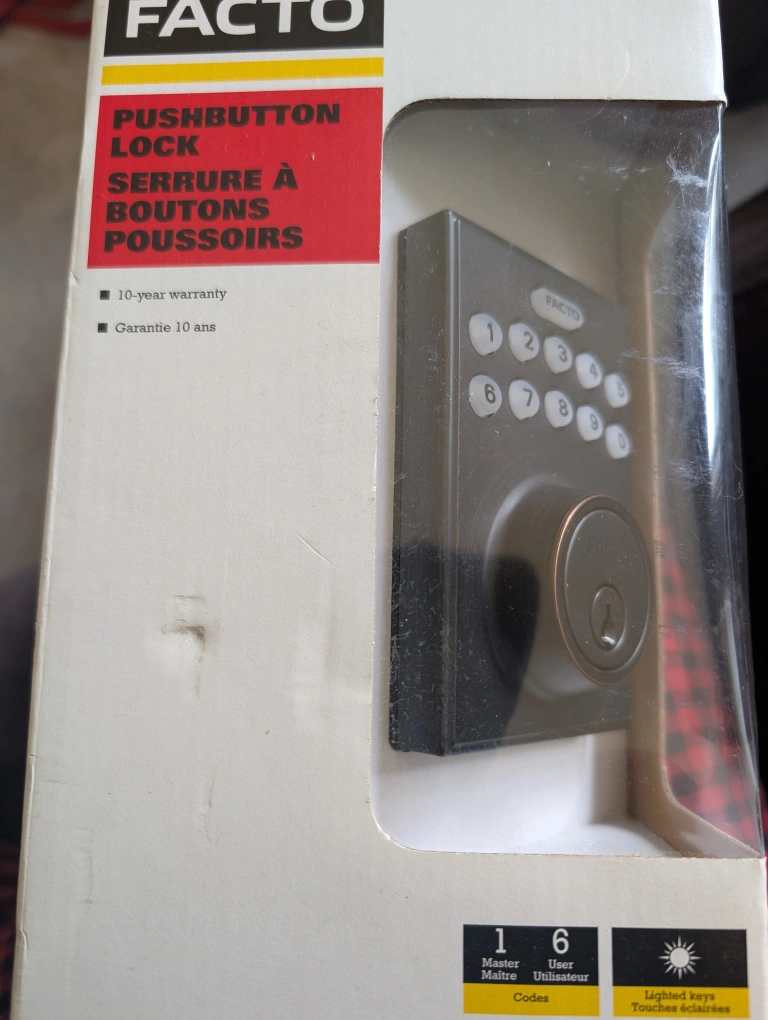 Selling a brand new Facto Pushbutton Lock! This lock offers keyless access and is battery powered. It features code protection and lighted keys.