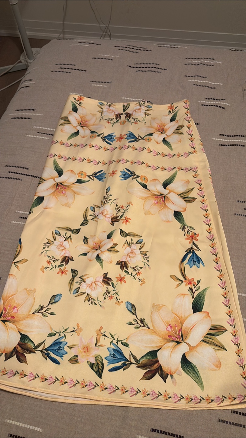 Selling a lovely floral print skirt in a soft yellow colour. It's in great condition and would be a beautiful addition to any outfit. The floral pattern includes lilies and other delicate flowers, adding a touch of elegance. Perfect for adding a pop of colour to your wardrobe!