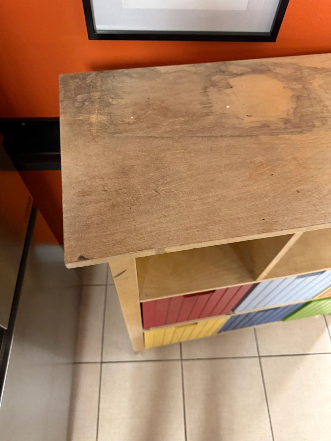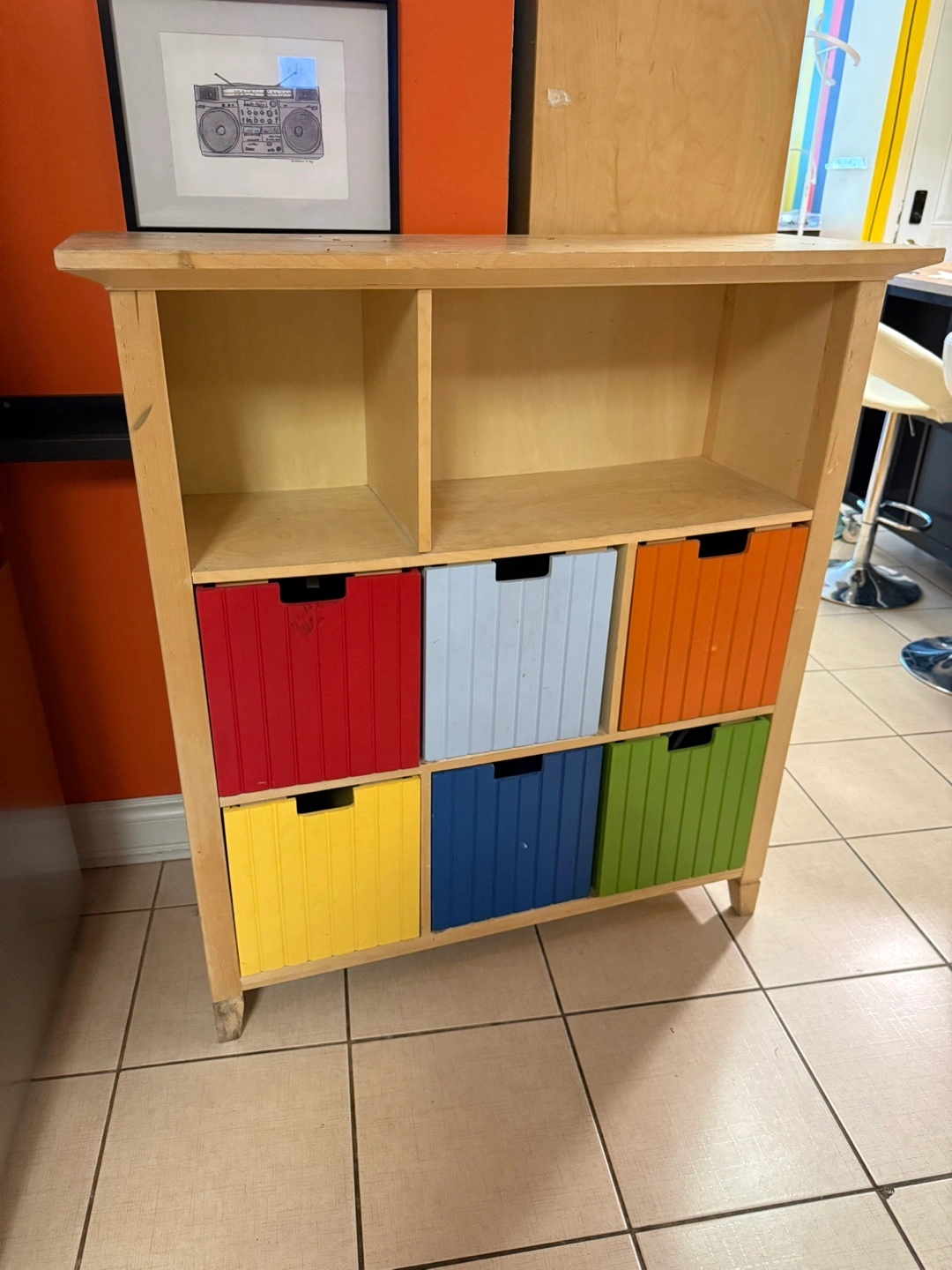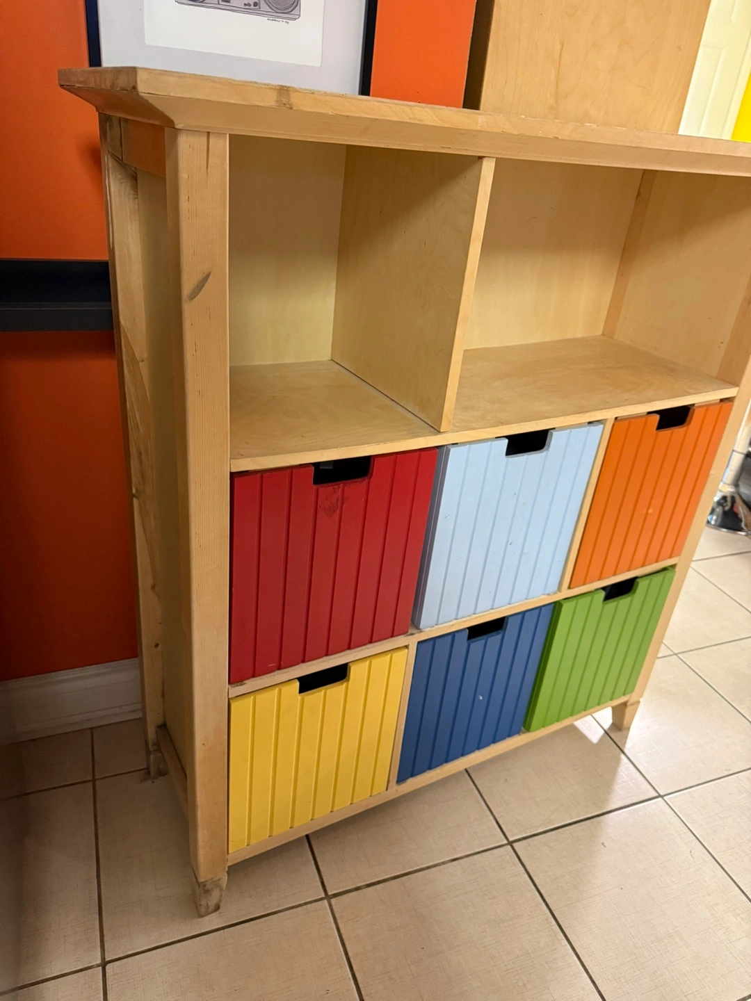 Selling a cute wooden shelf with colourful bins! It has a natural wood finish and includes red, blue, orange, yellow, and green bins. It's perfect for a kid's room or playroom to keep things organized. There are some signs of use on the top surface.