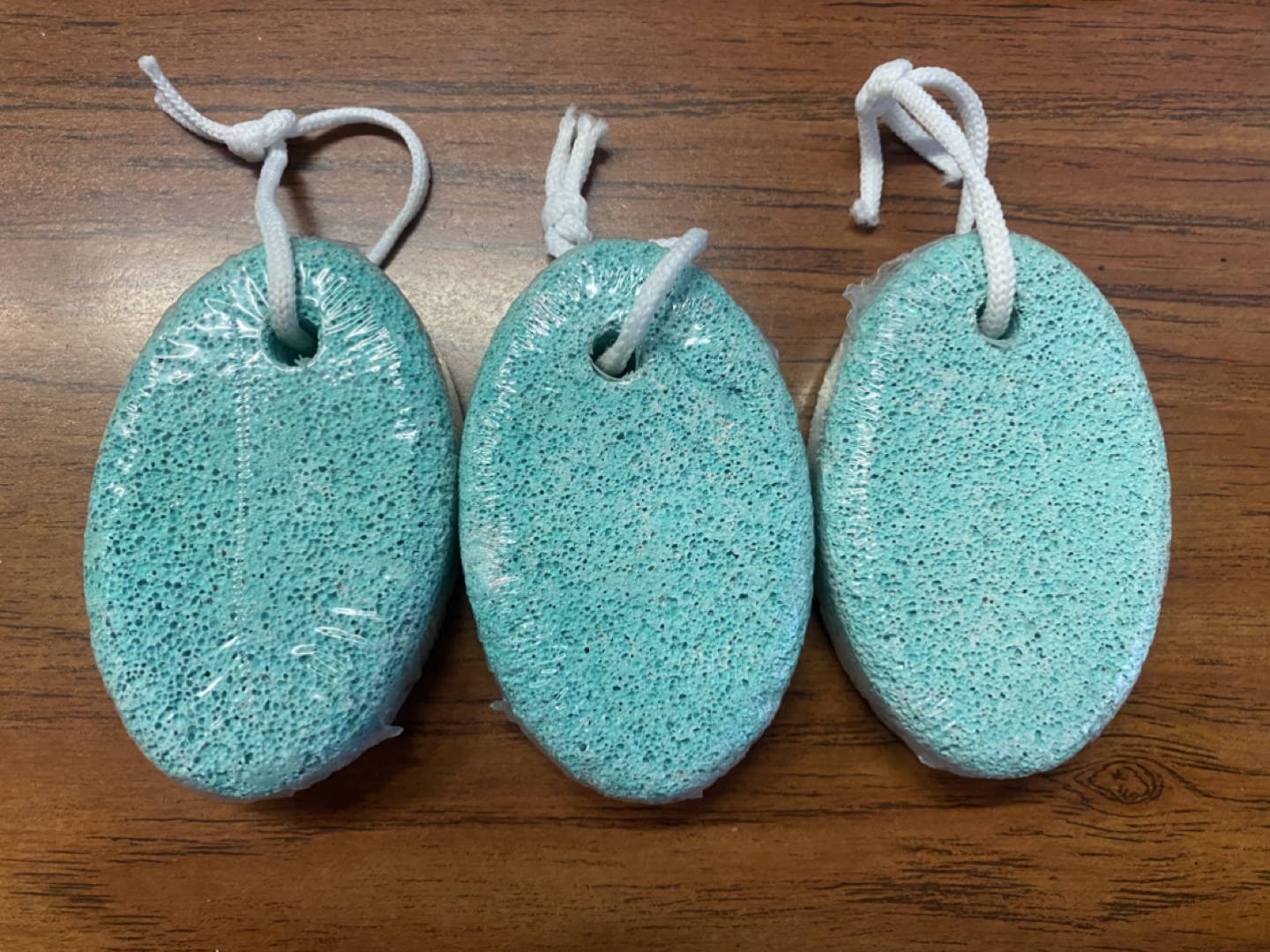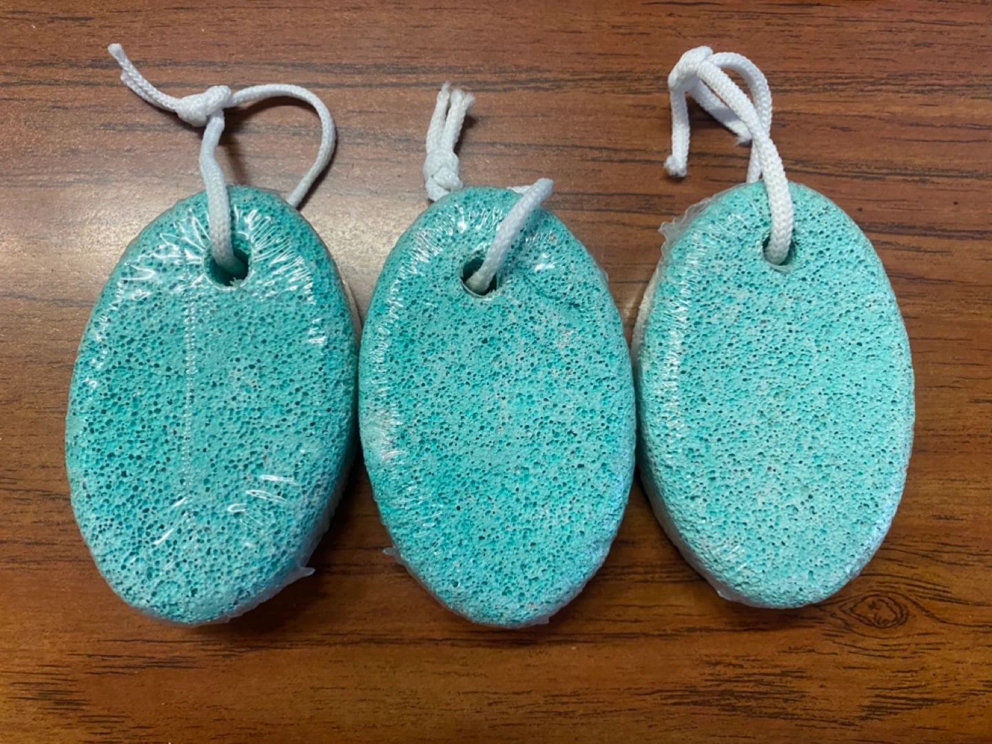 I'm selling these new pumice stones for your feet! They are still in their original packaging. The color is a nice turquoise. Perfect for exfoliating and smoothing your skin! They are about palm sized.