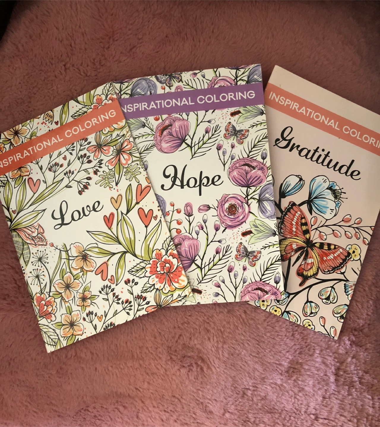 Set of coloring books that are perfect for relaxation and creativity! This set includes both Inspirational Coloring books with themes like "Love," "Hope," and "Gratitude," and Classic Coloring books featuring beautiful scenes. They are still sealed in their original packaging, so they're brand new!