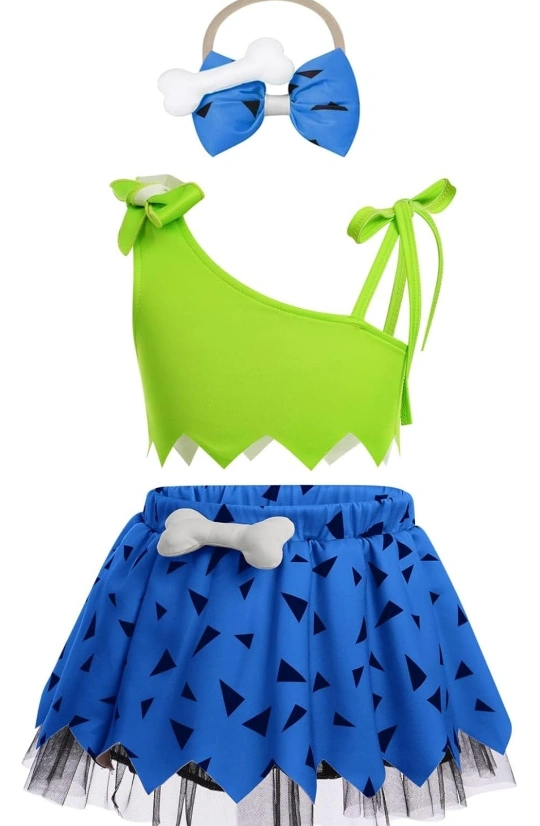 Pebbles Flintstone inspired costume. Size 3-6 months. It features a bright green top and a blue skirt with a bone detail and a headband.