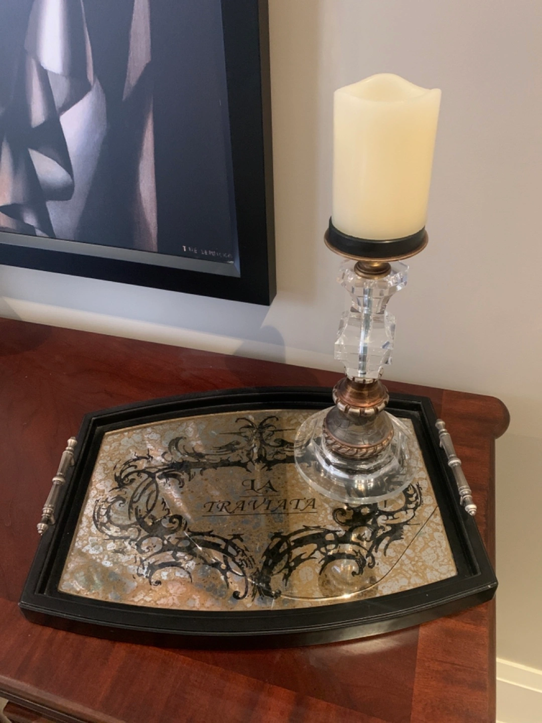 Selling a decorative tray featuring the design 'La Traviata'. Please note that the tray has a large crack in the glass as pictured.