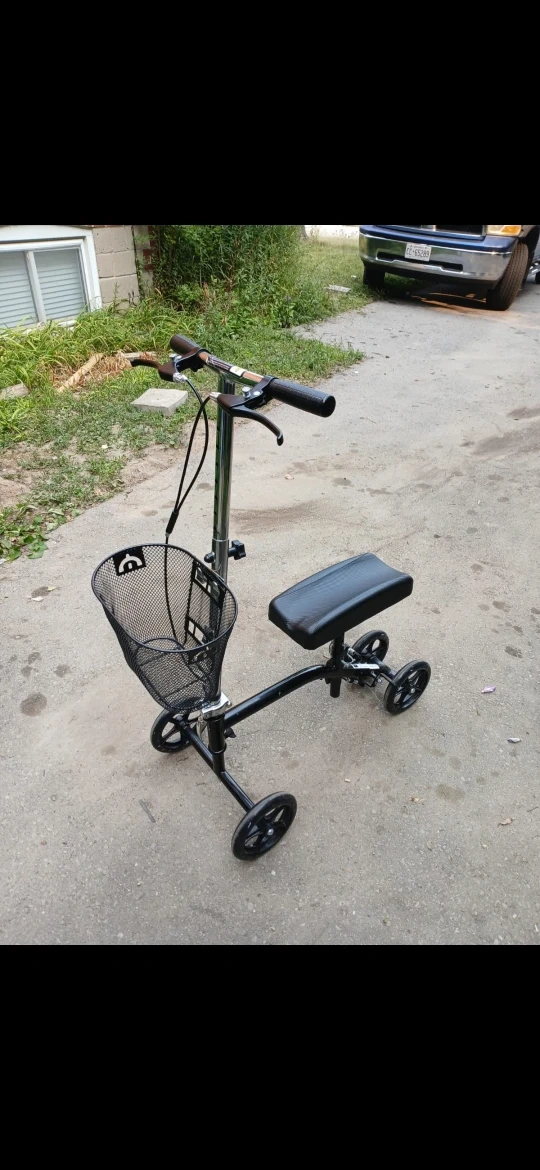 Selling a knee walker scooter. It's in good condition and ready to help you get around while recovering. It features a comfortable seat and a convenient basket for carrying your essentials. Perfect for anyone needing mobility support!