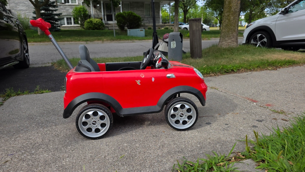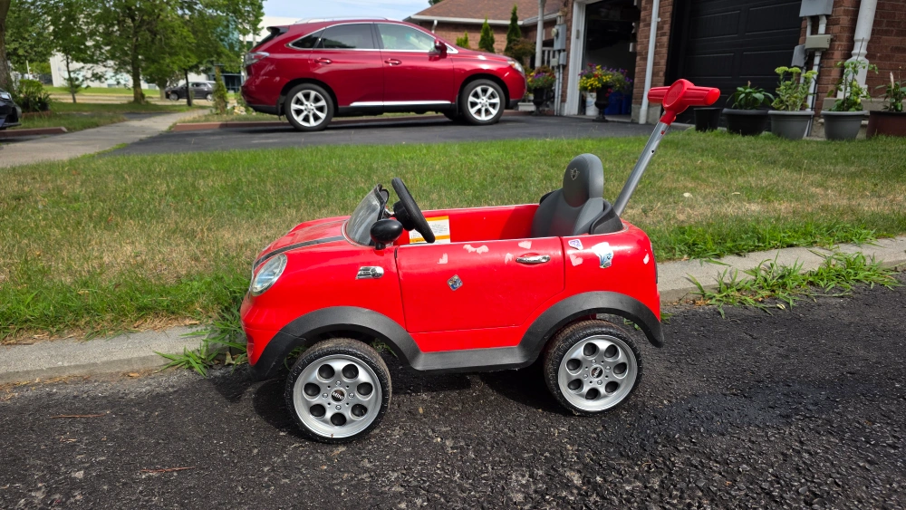 A fun red Mini Cooper ride-on car for kids! It's in great condition and ready for a new little driver. Perfect for outdoor adventures and imaginative play