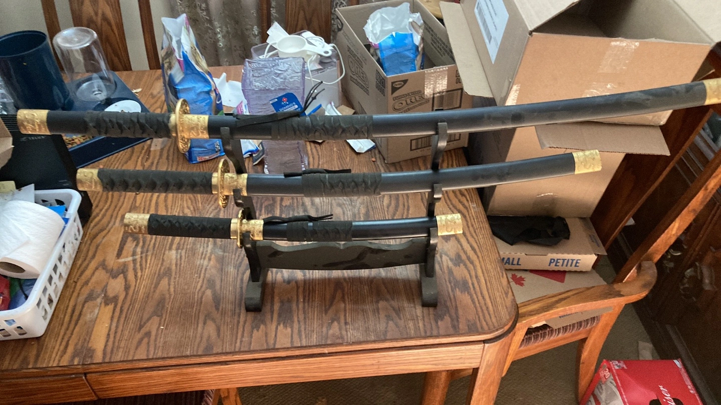 Selling a set of decorative katana swords. They come with a display stand. Great for adding a touch of Japanese-inspired decor to your home! Made with 440 stainless steel. If you are interested reach out to me. Don’t let karrot do it for you.