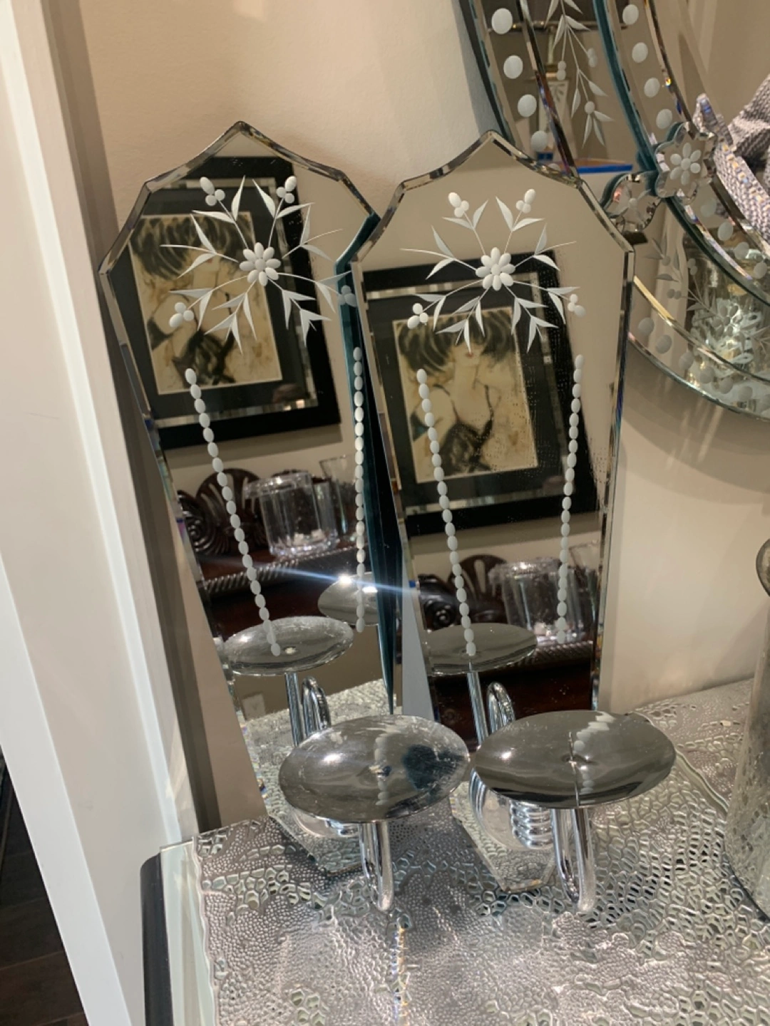 Here's a pair of beautiful Venetian mirrored wall sconces! They're in great shape and would add a touch of elegance to any room. Perfect for creating a soft, ambient light.