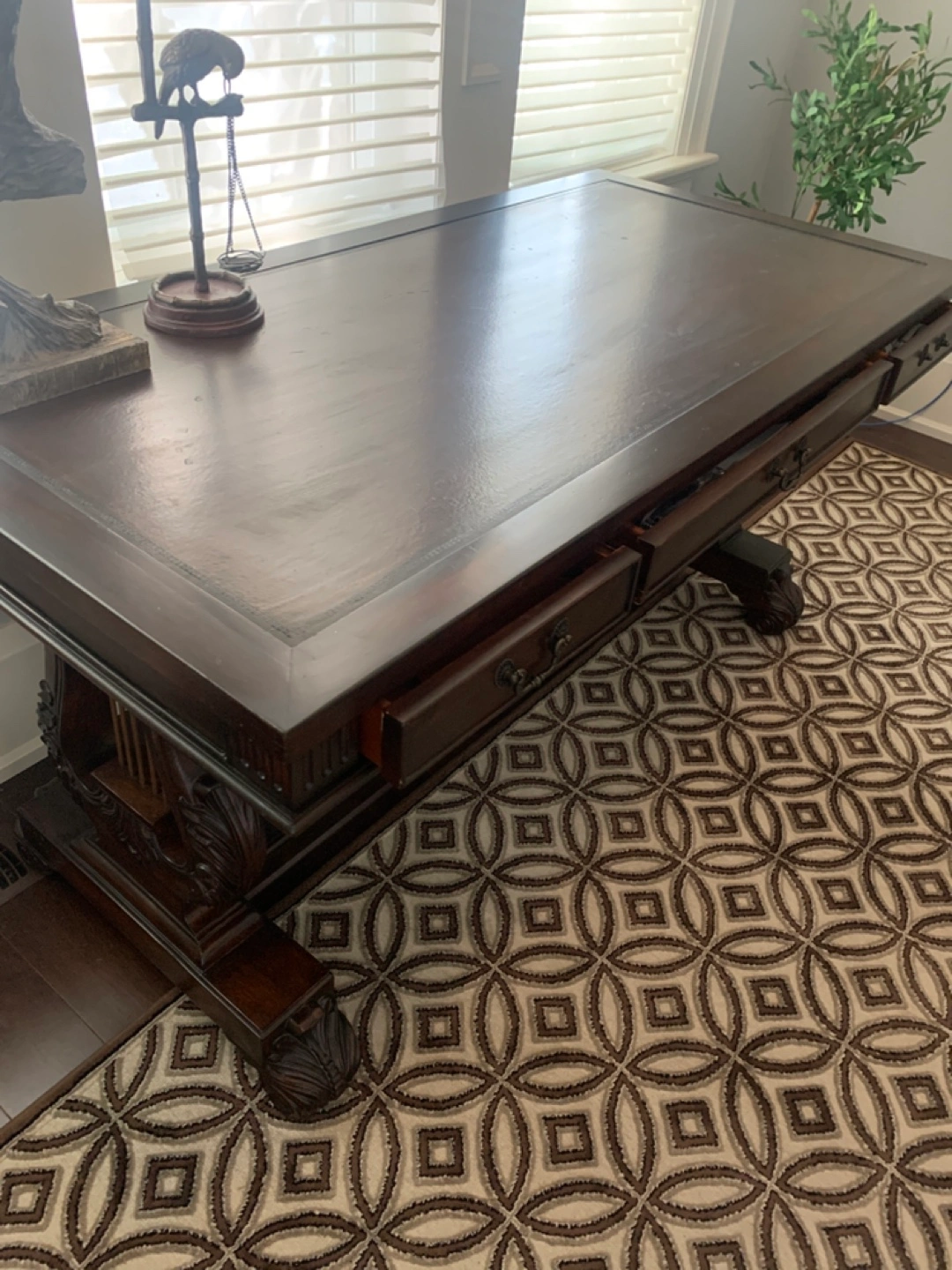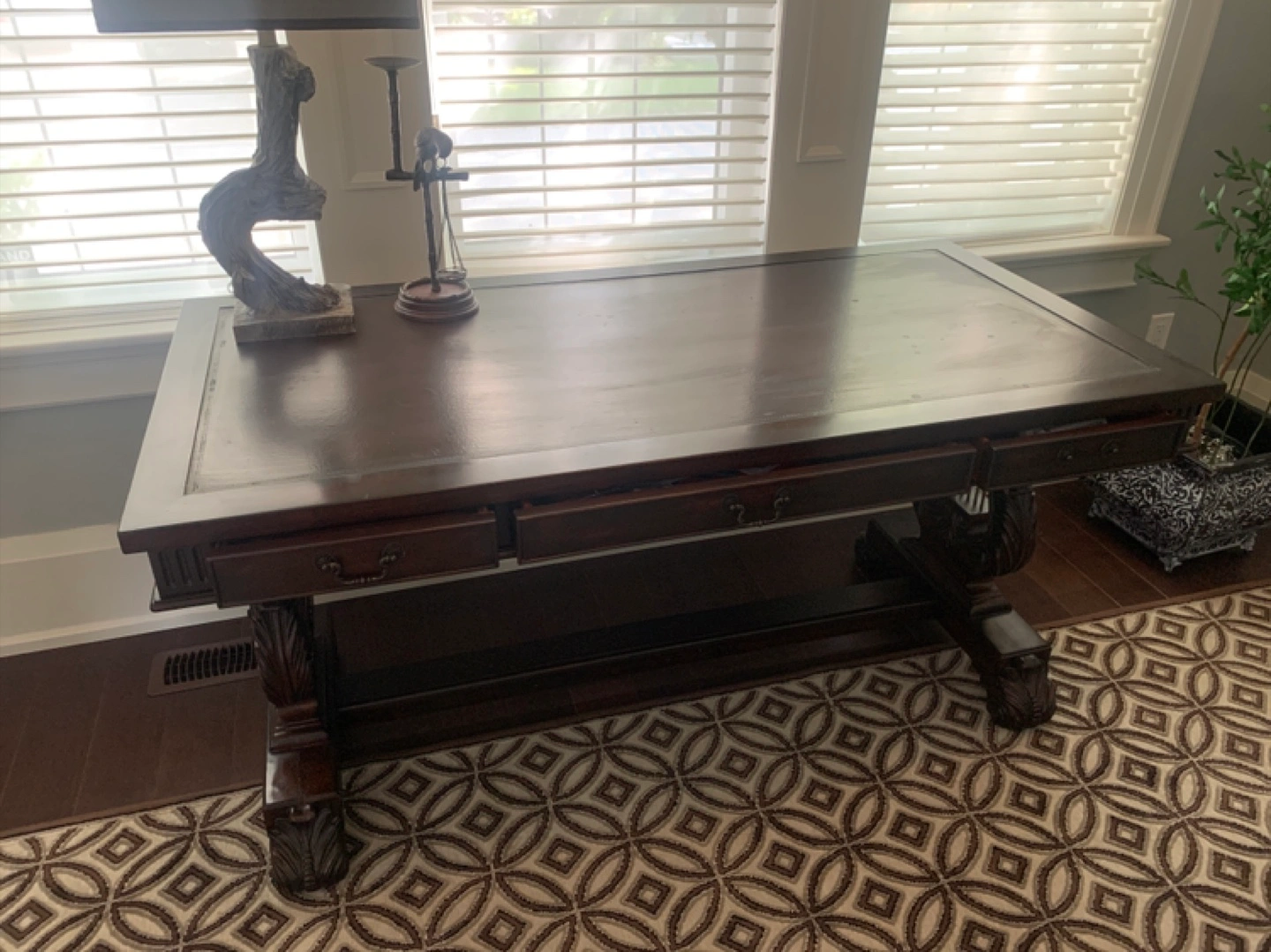 Dark wood desk with drawers in good condition. Perfect for a home office or study space. Sturdy and stylish! Approximately 6 feet long by 4 feet wide.
