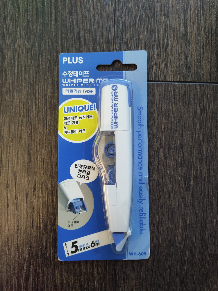 This is a PLUS WHIPER MR5 correction tape. It features a unique design with a mini roller head and smooth performance. The tape is 5mm x 6m and easily refillable