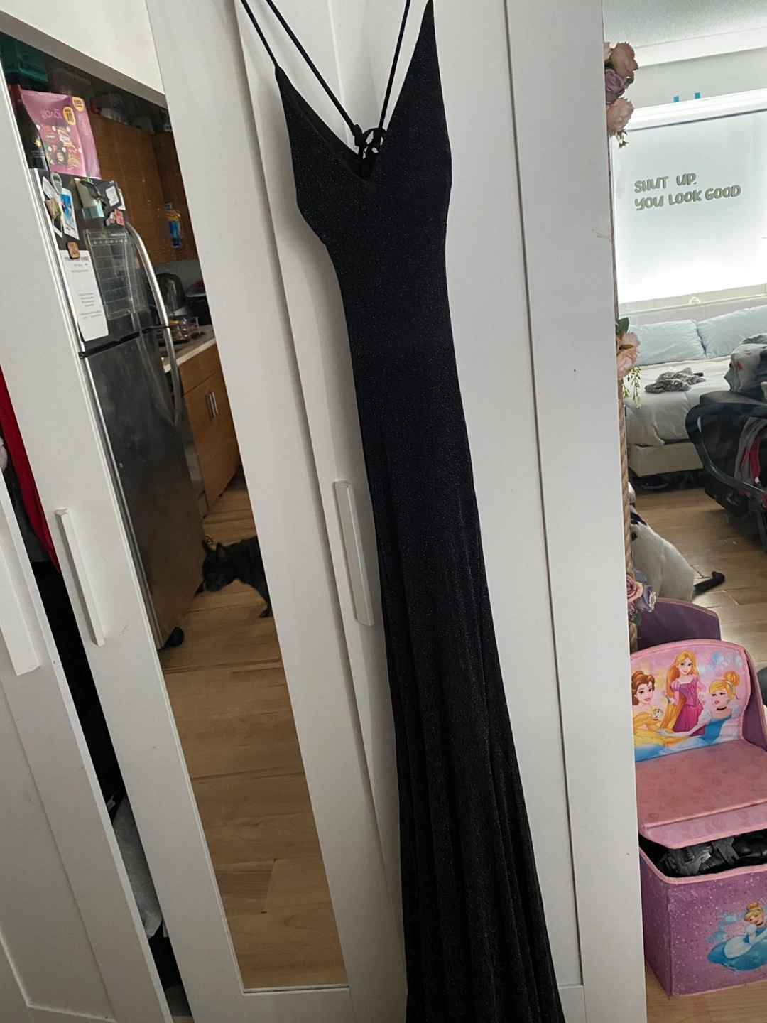 Selling a beautiful black maxi dress! It has a flattering silhouette and is perfect for a night out or special occasion. The material has a subtle shimmer, adding a touch of elegance. It has a crisscross back.