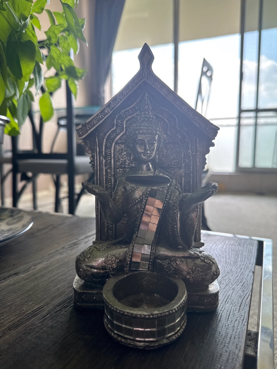 This is a beautiful Buddha statue that also serves as a candle holder. It's in great condition and would look lovely in any room of your home. It has intricate details and a serene design, perfect for creating a calming atmosphere.