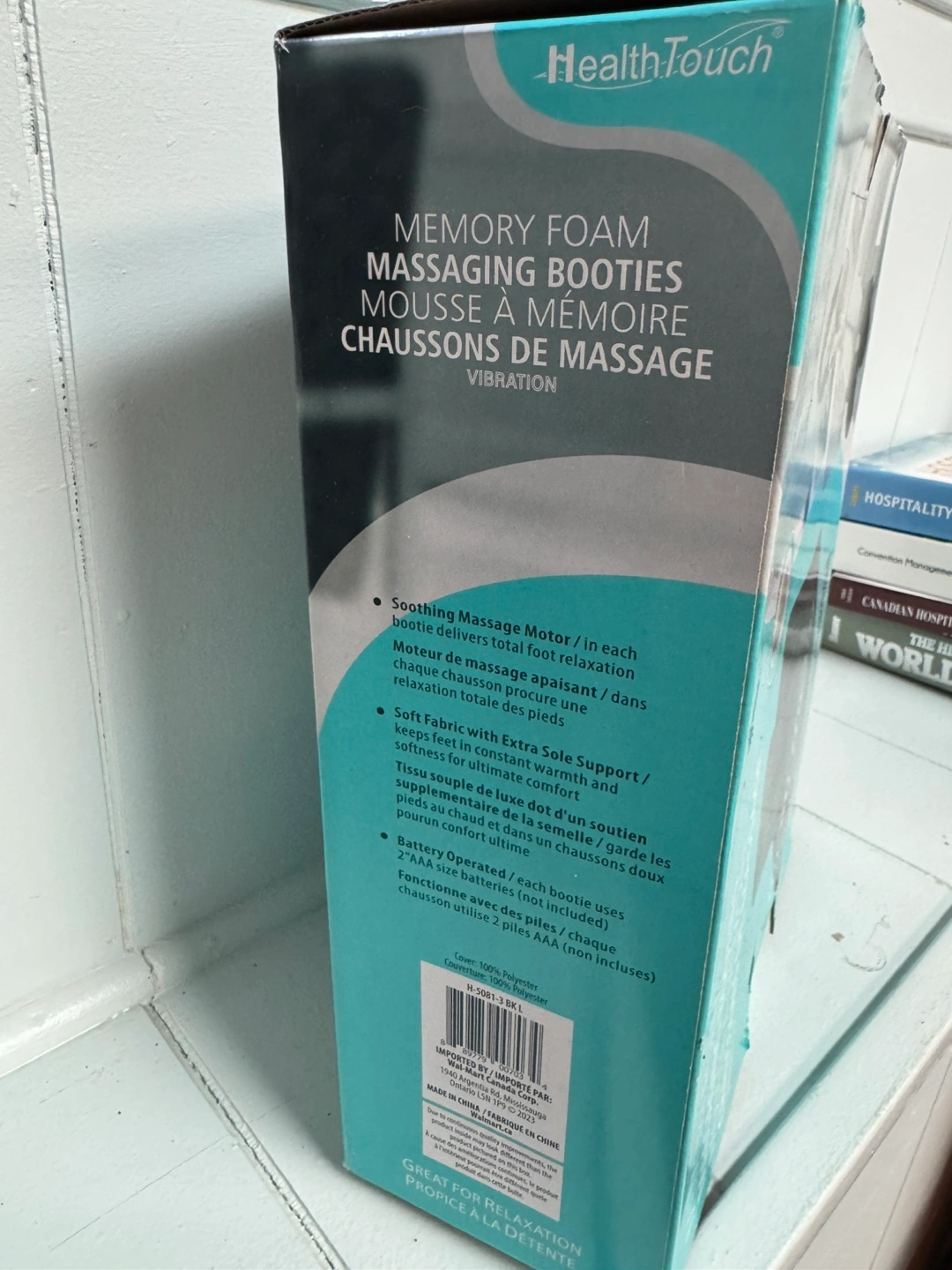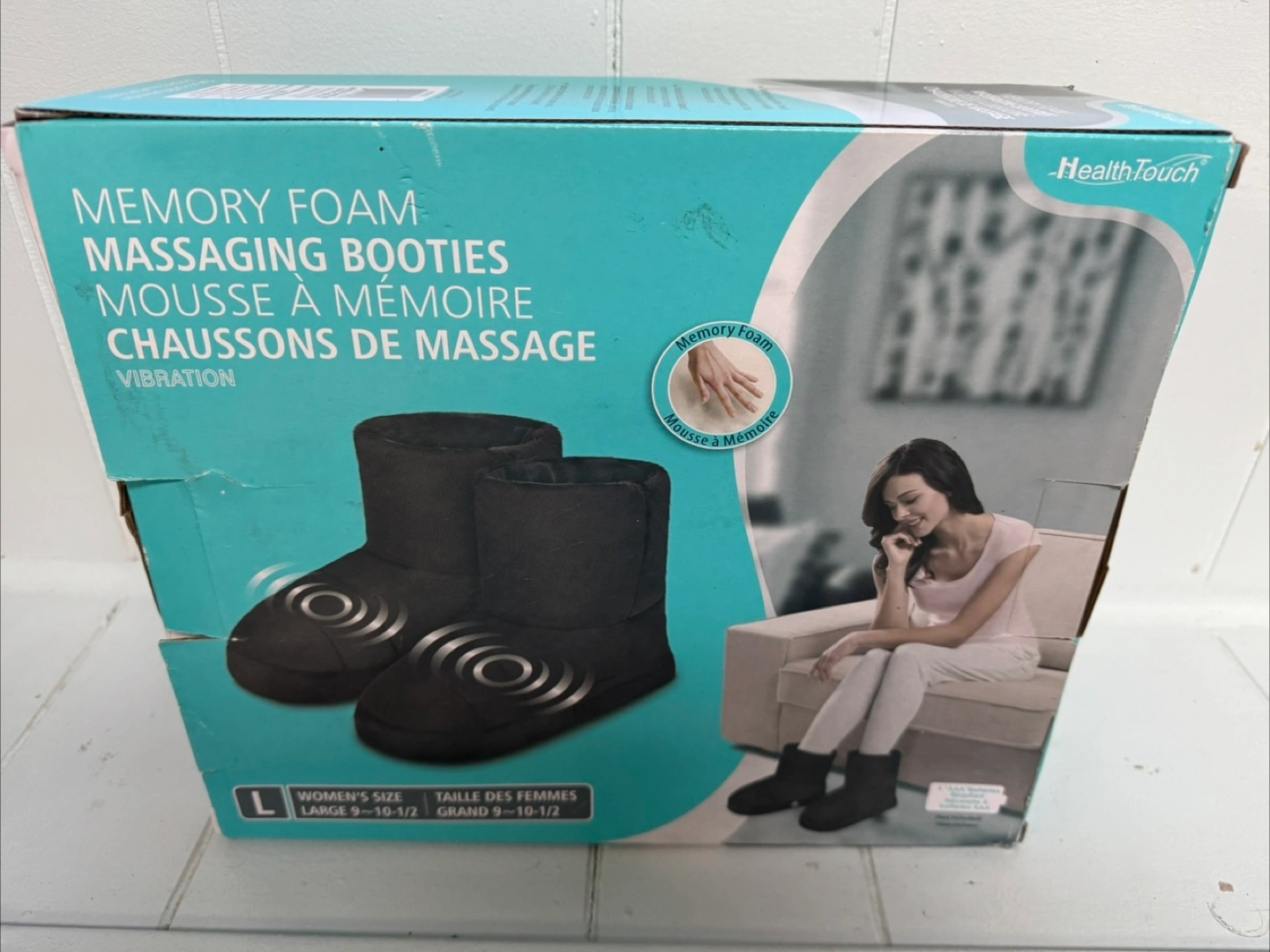 Treat your feet with these Health Touch memory foam massaging booties! They offer total foot relaxation with a soothing massage motor in each bootie. The soft fabric with extra sole support keeps your feet constantly warm and provides ultimate comfort. These booties operate on 2 AAA batteries each (not included). Size L (Women's size Large 9-10 1/2).