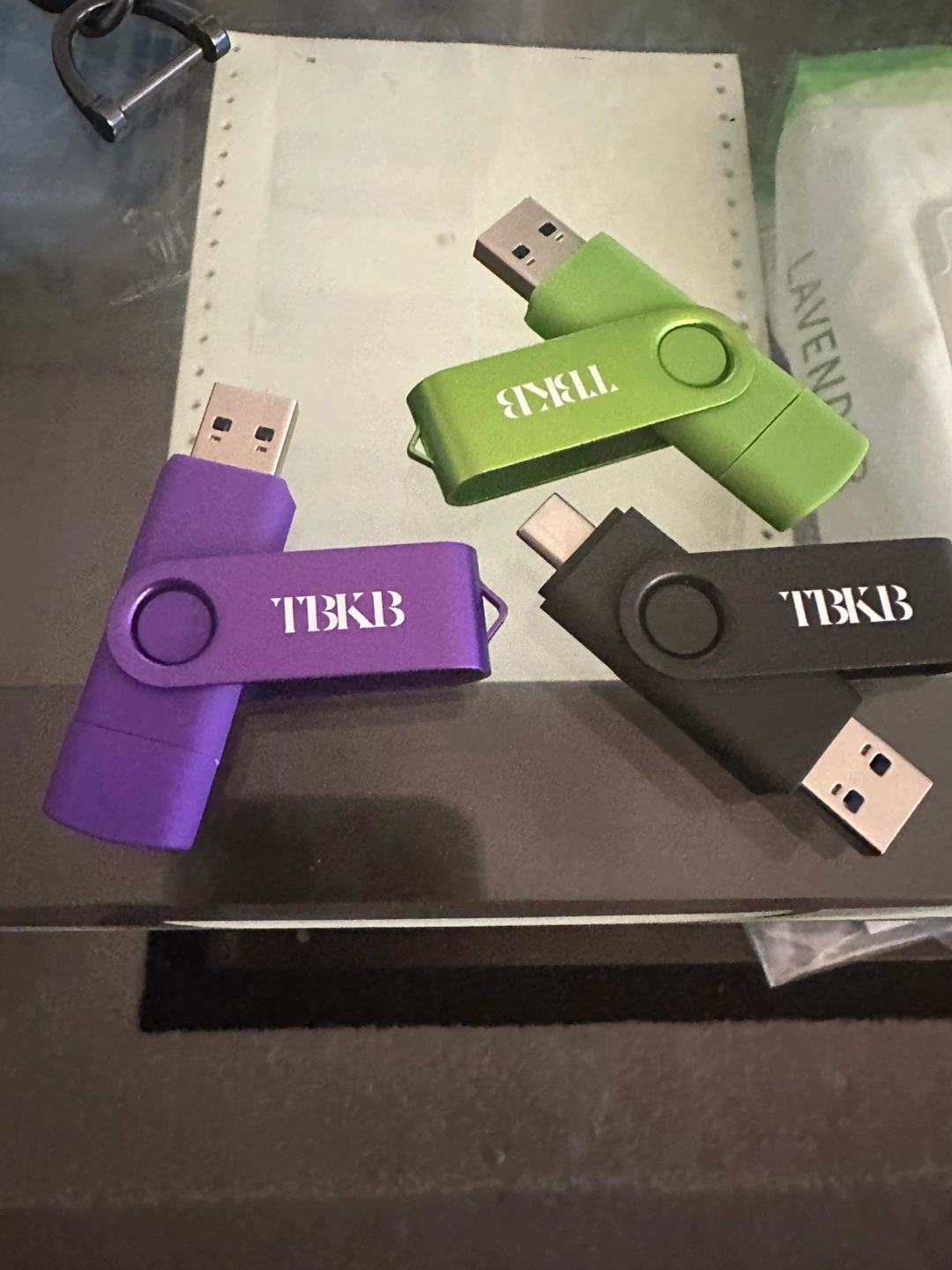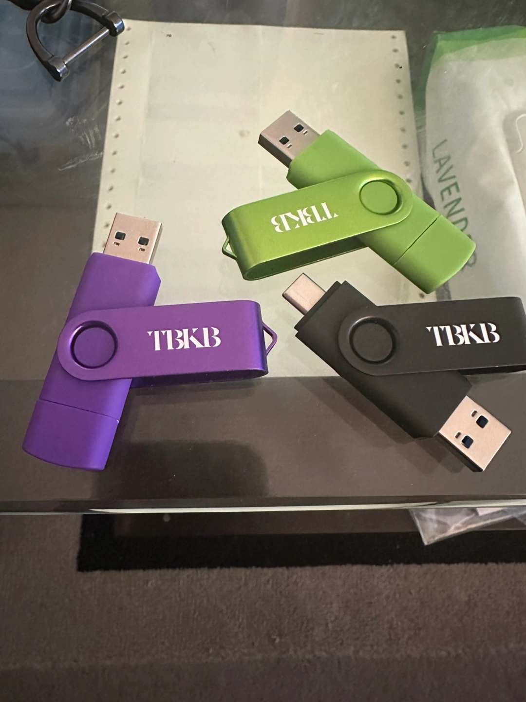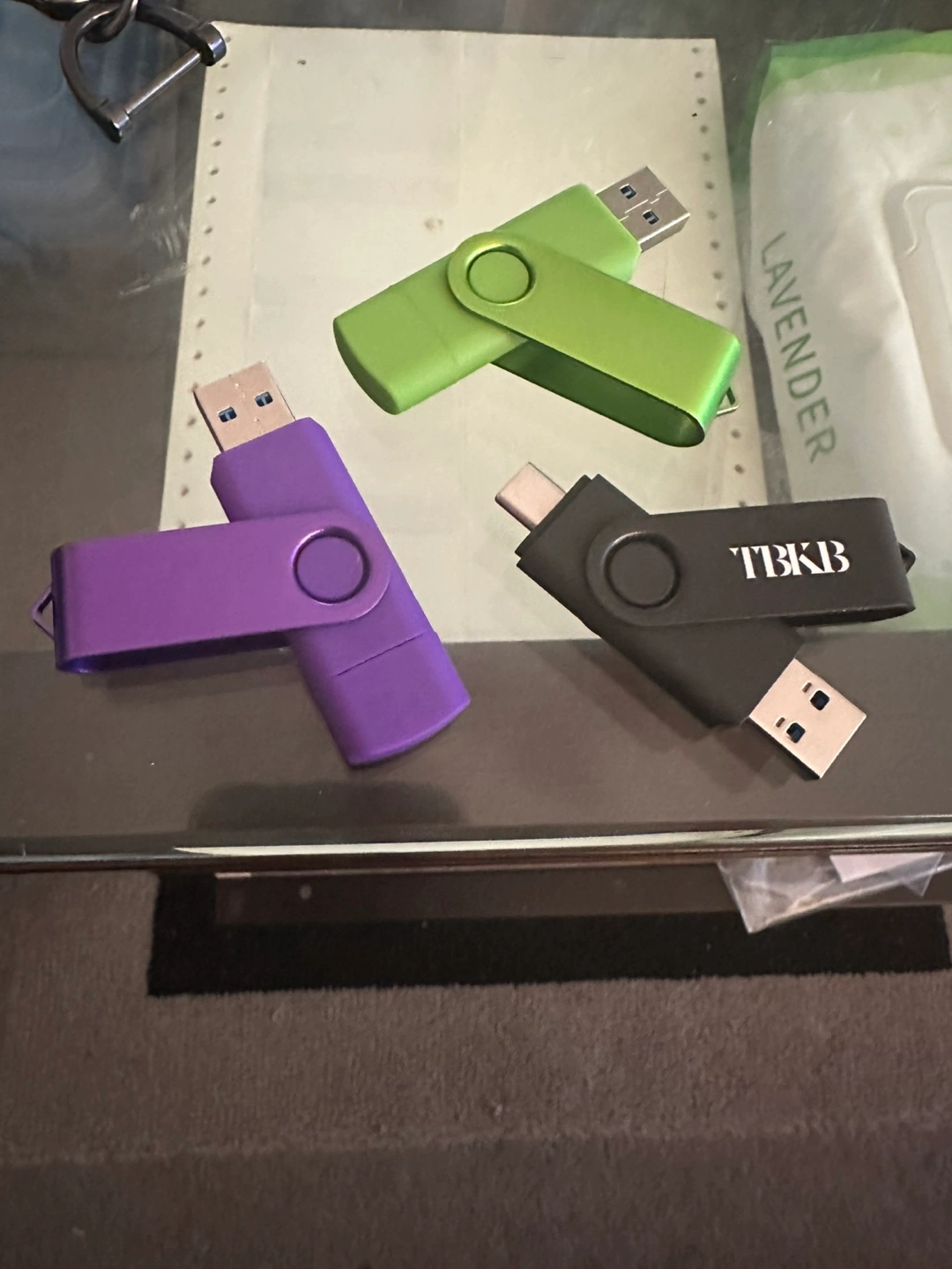 Selling a set of Tbkb USB flash drives in green, purple, and black. They appear to be in great condition and ready to use for your data storage needs 64GB(Type-C&USB 3.0) 10/ dollar each