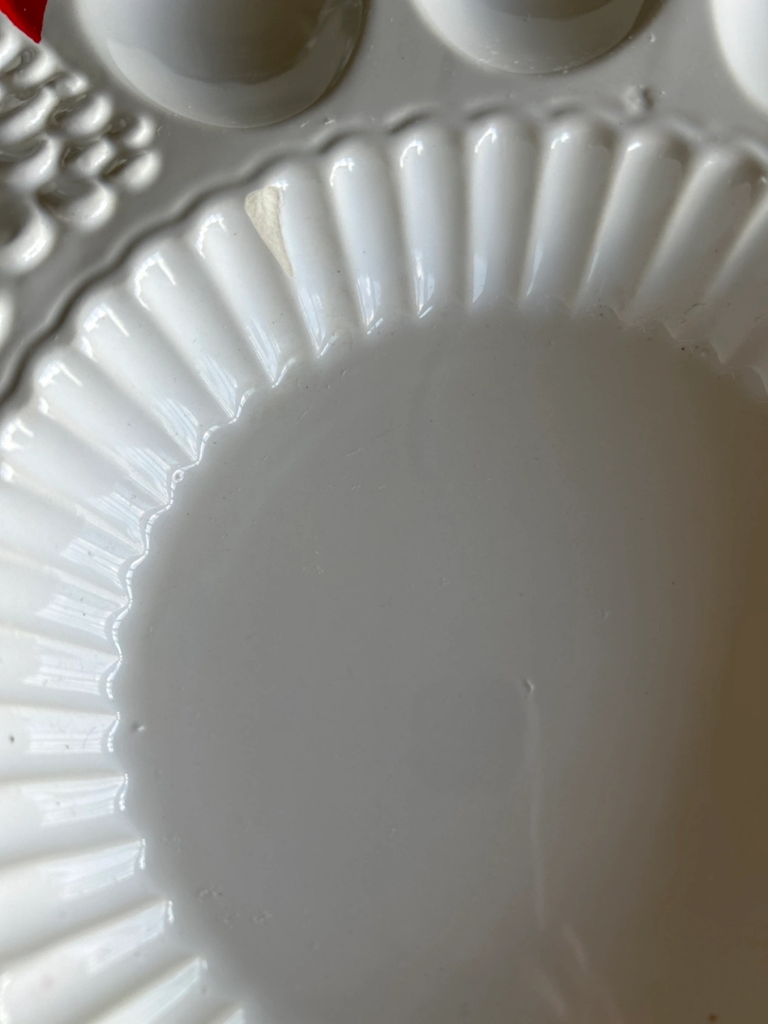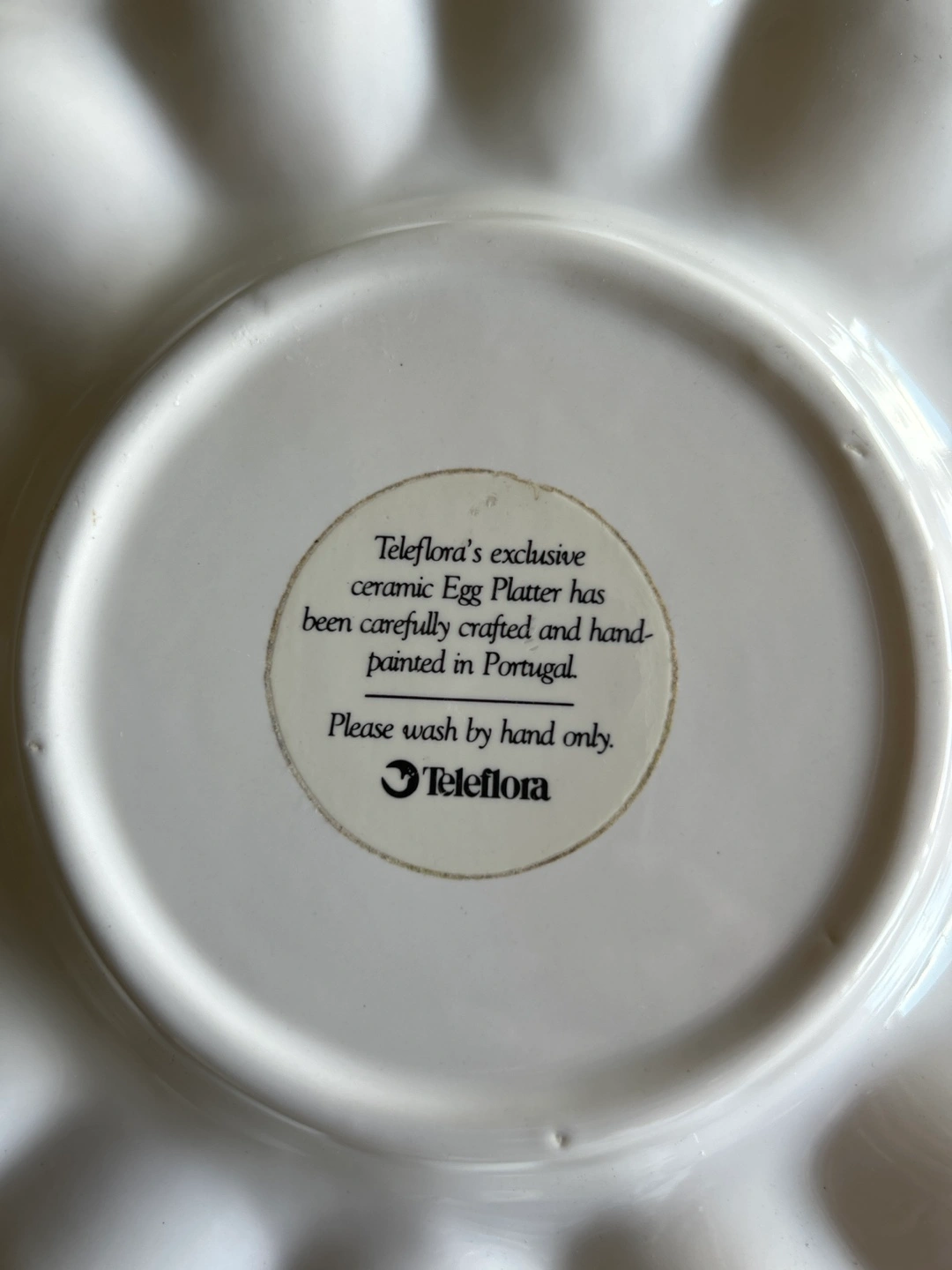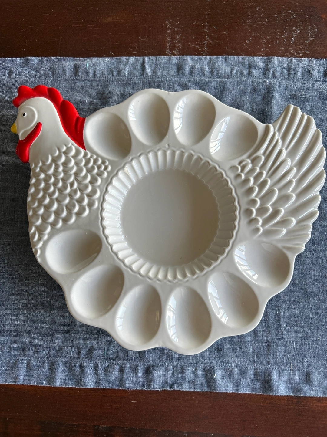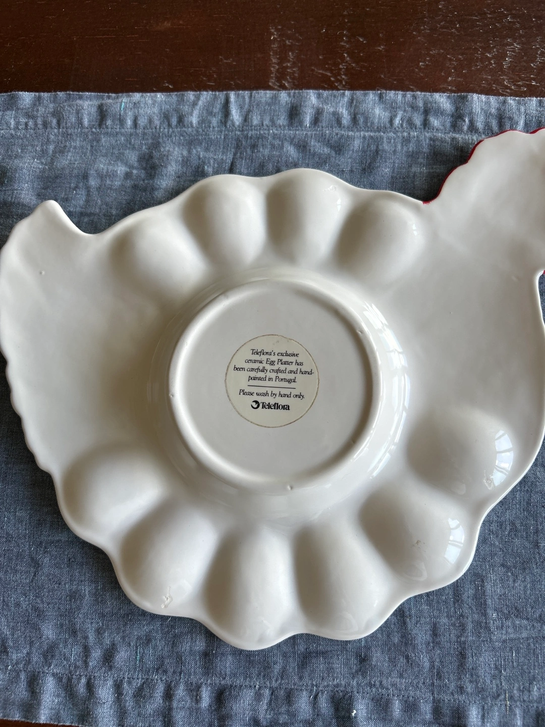 246Chicken shaped deviled egg platter. Vintage Teleflora exclusive ceramic egg platter, carefully crafted and hand-painted in. One small chip In the centre as seen in pic. Not very noticeable. Please wash by hand only.