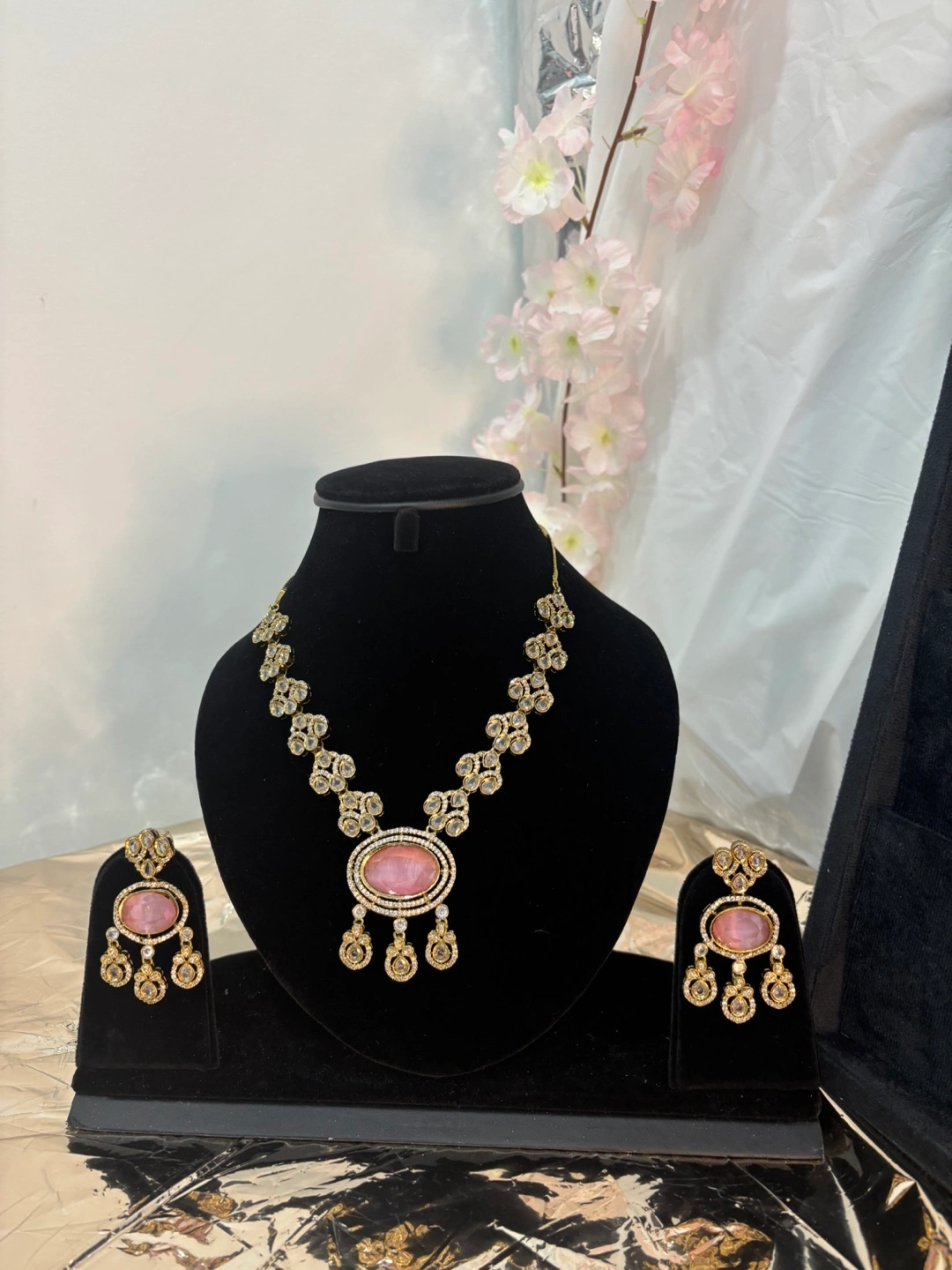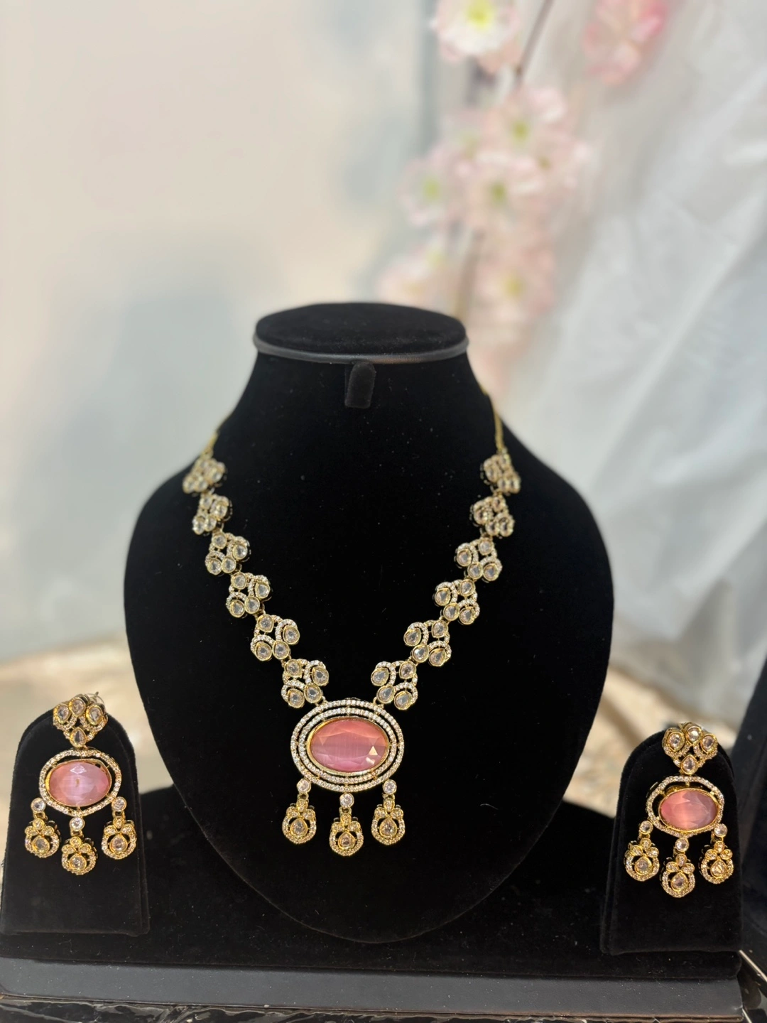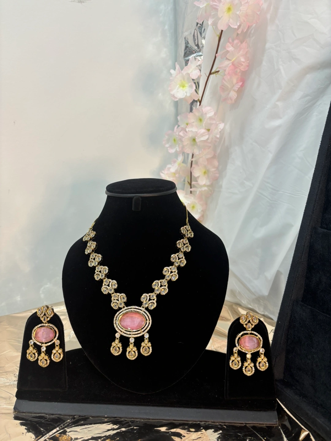 Beautiful necklace and earring set featuring pink stones and intricate detailing Perfect for adding a touch of elegance to any outfit