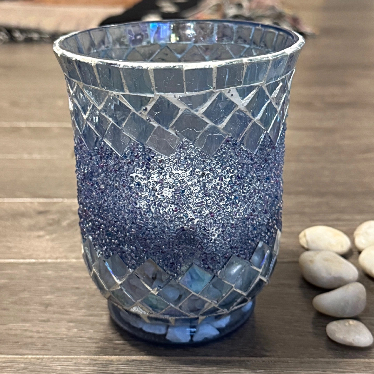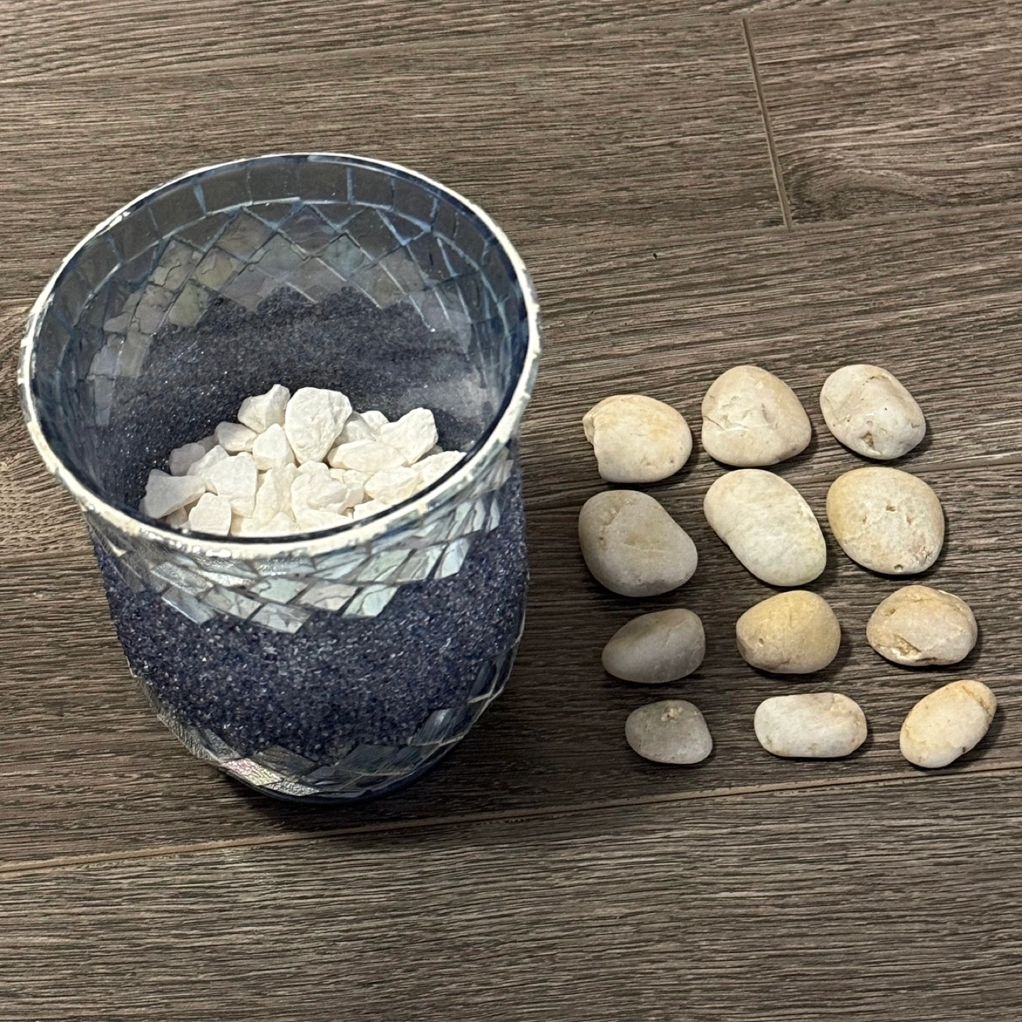 Selling a lovely mosaic glass vase, perfect for adding a touch of sparkle to your home! It comes with a handful of smooth, white rocks inside that complement the vase beautifully. Great for holding flowers or as a decorative piece on its own. Comes with 12 clear quartz crystals on the side as well ! CASH ONLY PICK UP ONLY