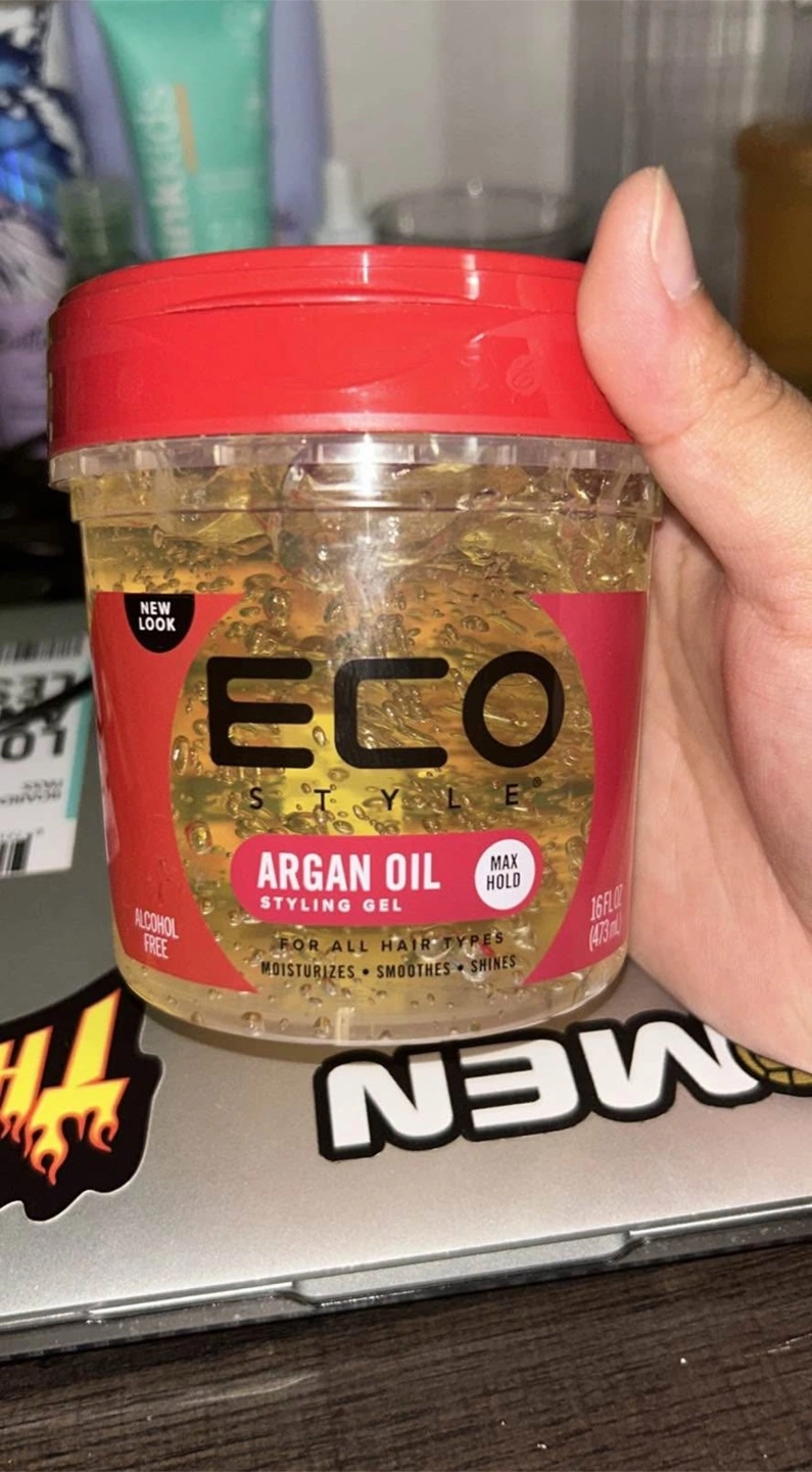 Selling a 16 fl oz container of Eco Style Argan Oil Styling Gel It's alcohol-free and formulated for all hair types, promising to moisturize, smooth, and add shine
