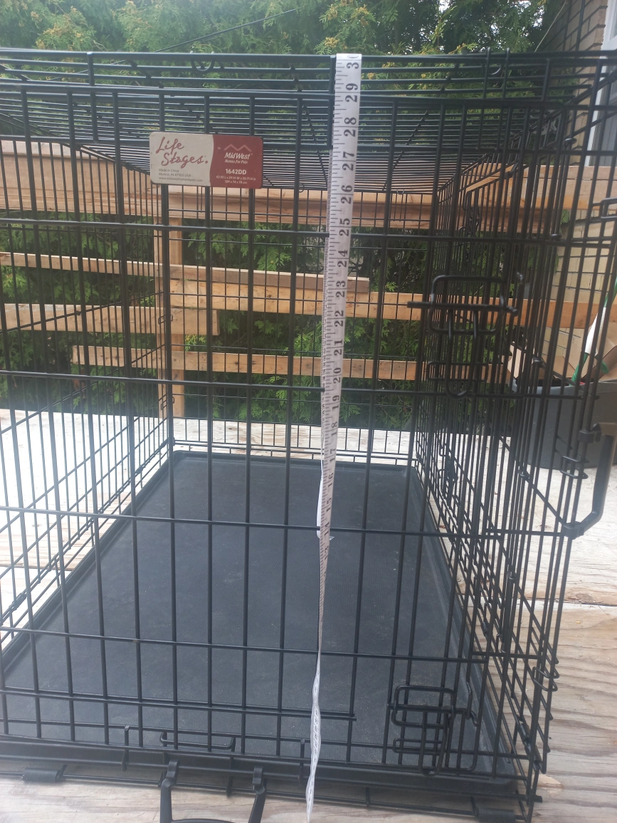 Selling a black Life Stages MidWest dog crate. It measures approximately 42 inches long, 28 inches wide, and 30 inches tall. Lightly used for only 3 months, originally bought for $150