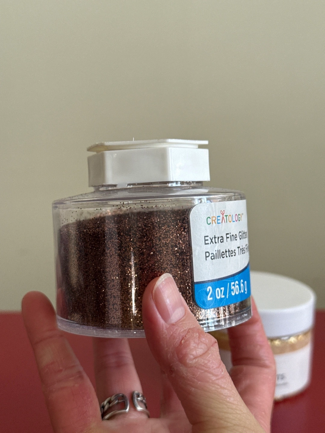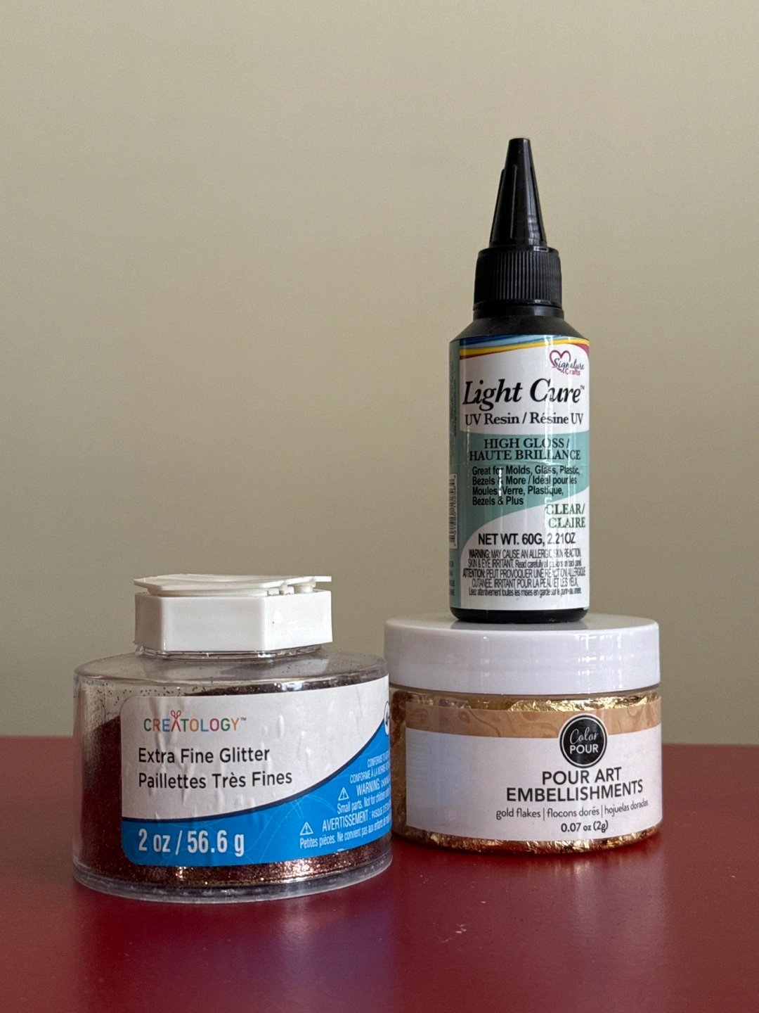 The Creatology glitter is in a 2 oz / 56.6 g container. The Pour Art Embellishments are gold flakes in a 0.07 oz container, both gently used and have 95% of their original contents inside.