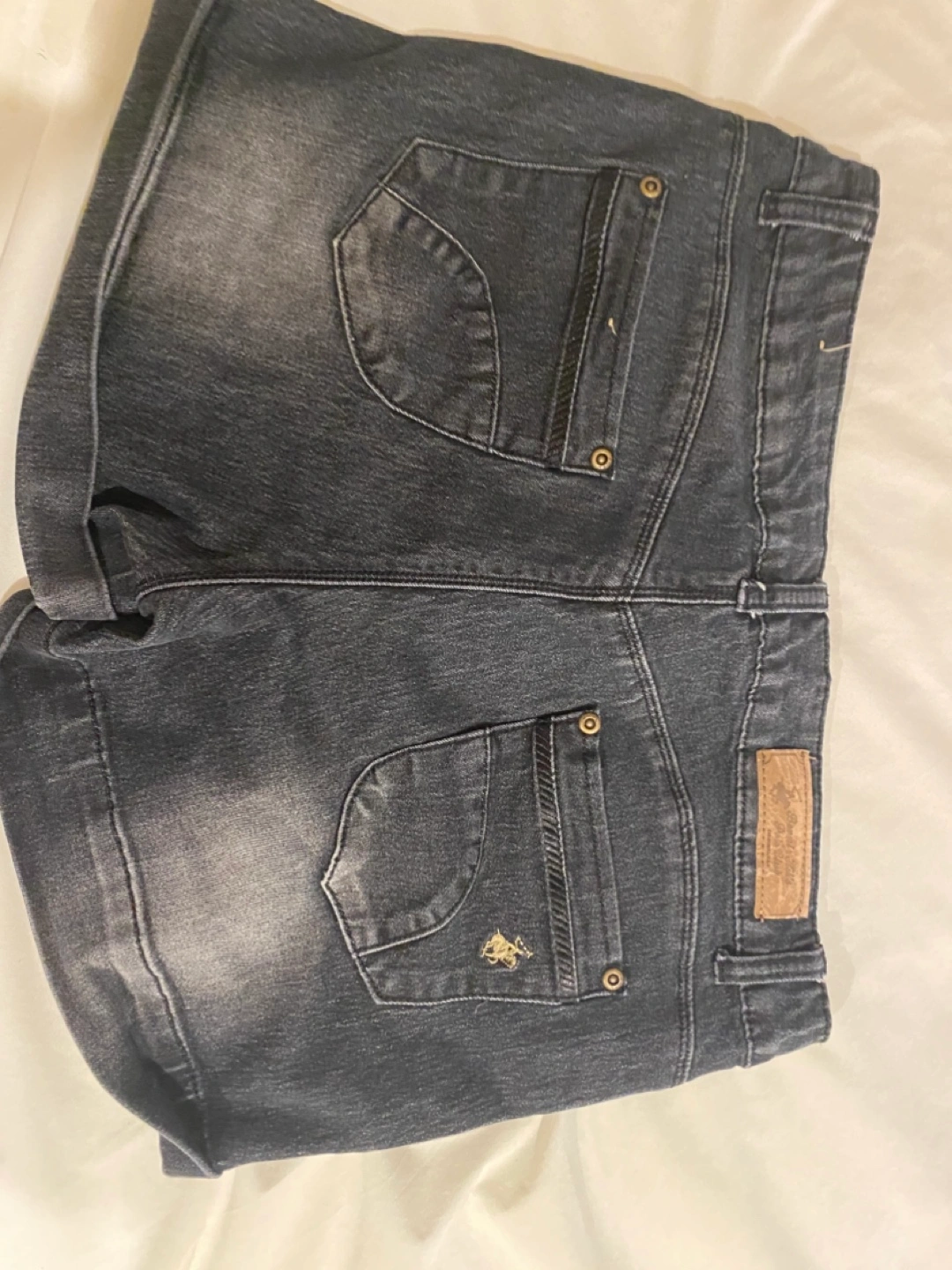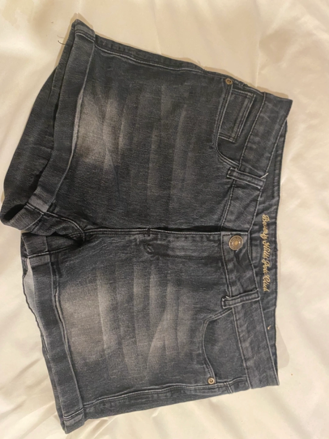 These are a pair of Beverly Hills Polo Club denim shorts. They are a dark wash and have a rolled cuff. They are in good condition