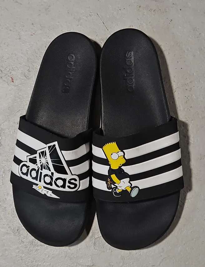These are a pair of Adidas Adilette slides, size US 9. They feature a fun design with The Simpsons character Bart. Great for casual wear! Excellent used condition, hardly worn, like new!