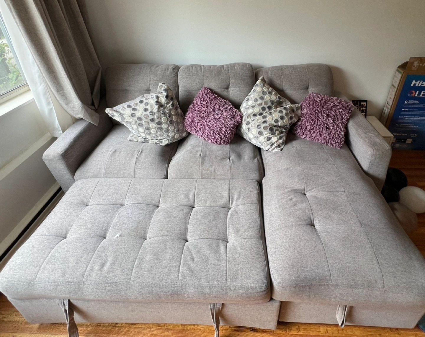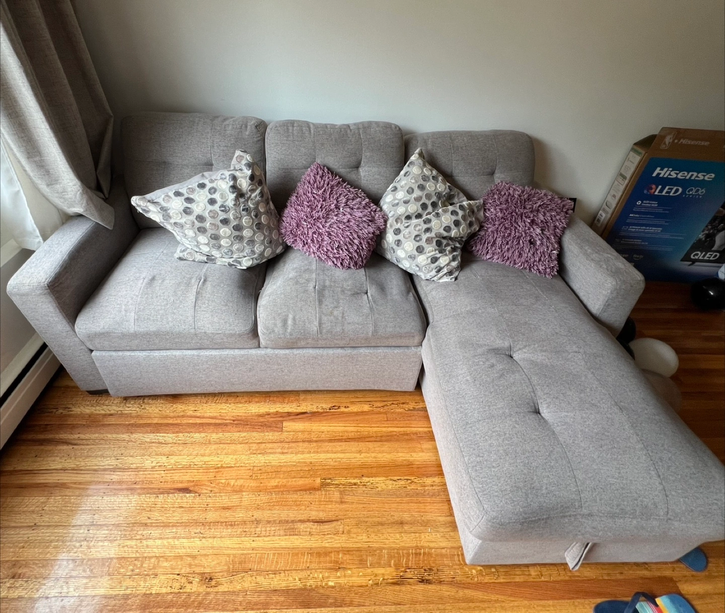 Selling a comfy grey sectional sofa with a chaise lounge! It's in great condition and perfect for relaxing or entertaining. The cushions are soft and supportive, and the chaise is ideal for stretching out after a long day. It's a great addition to any living room!