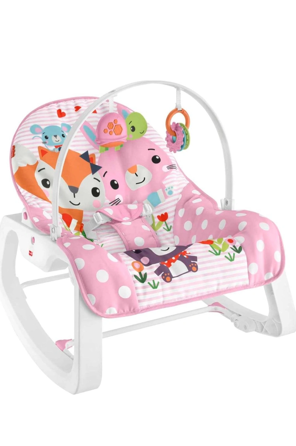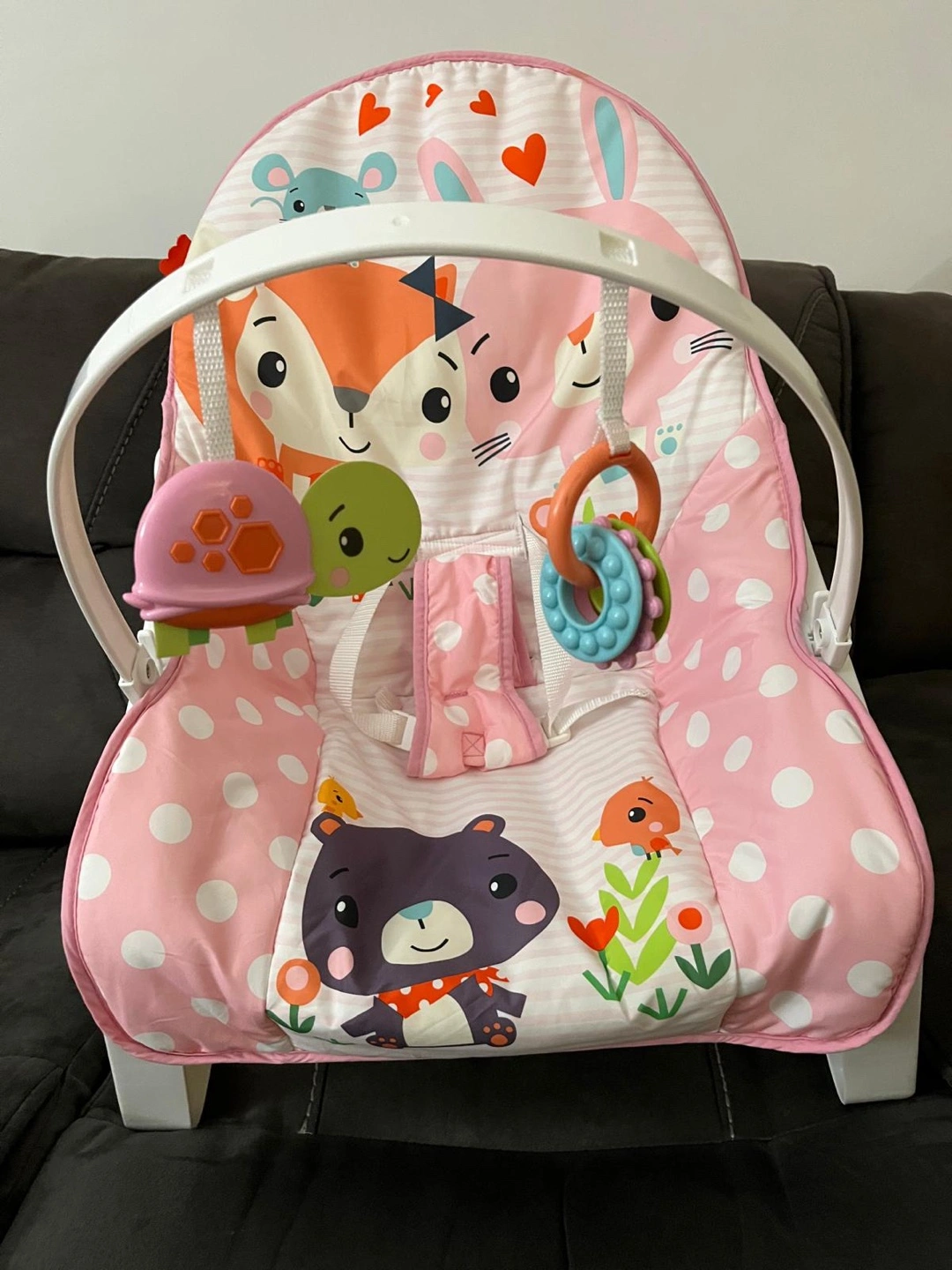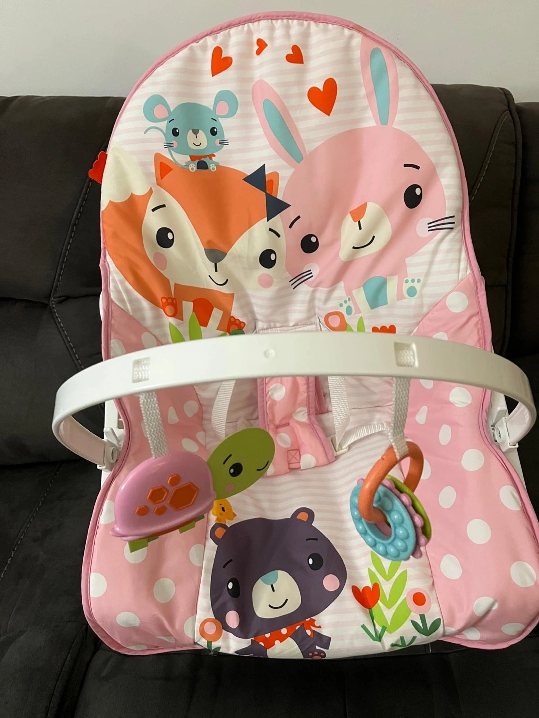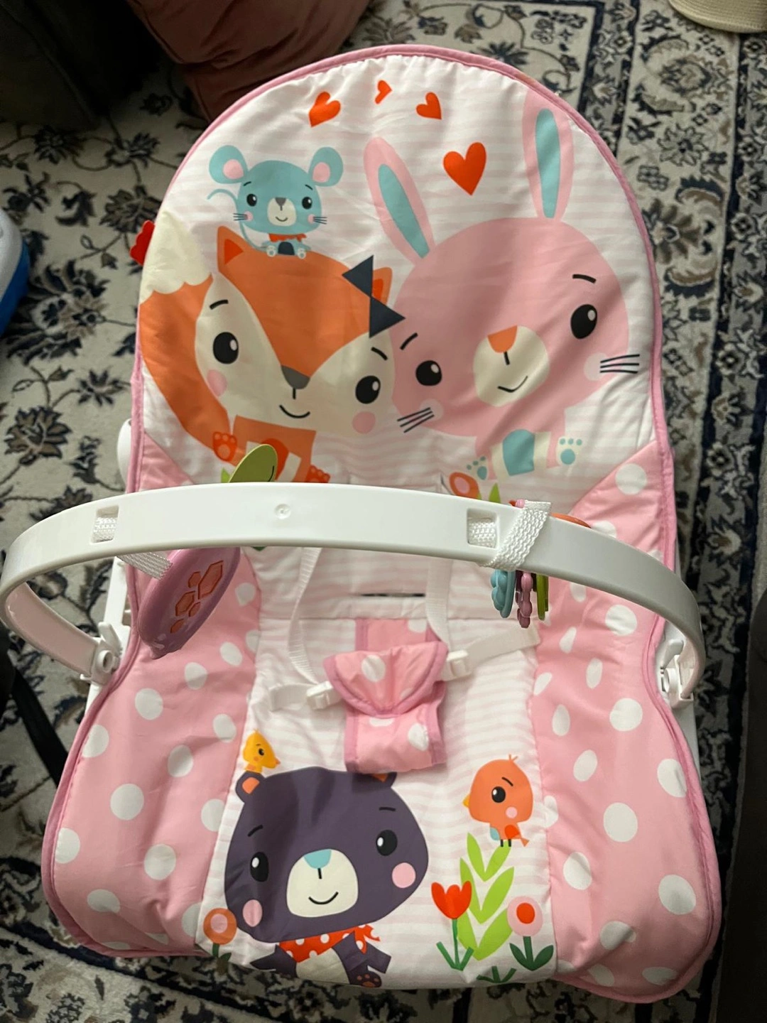 Selling a Fisher-Price baby bouncer seat! It's in great shape and ready for a new little one. The seat features a cute animal design with a fox, bunny, bear, and other friendly creatures. It also has a foldout kickstand to switch to stationary seating.