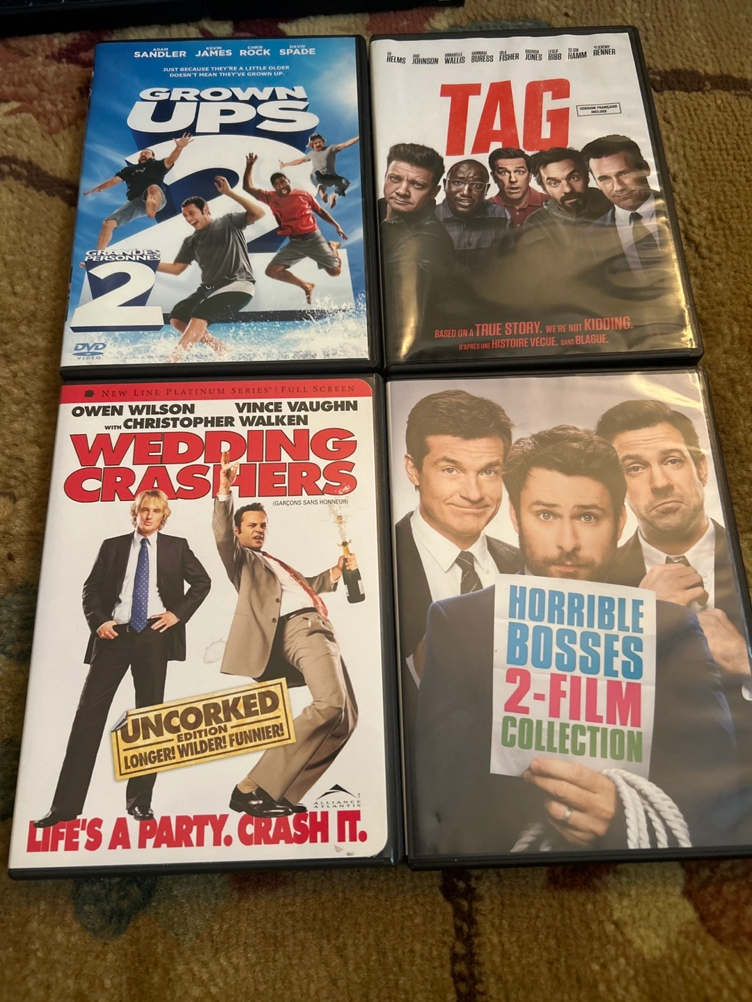 Selling a collection of DVD movies! Includes: - Grown Ups 2 - Tag - Wedding Crashers (Uncorked Edition) - Horrible Bosses 2-Film Collection
