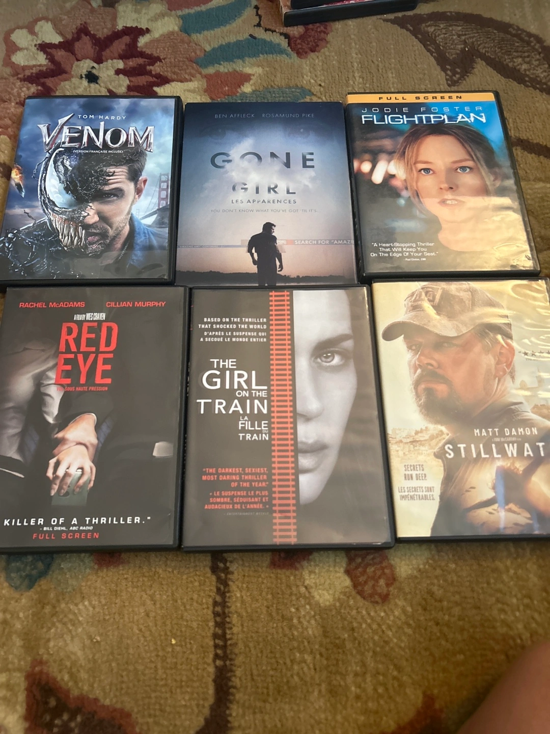 Selling a collection of DVD movies! Titles include: - Venom (Tom Hardy) - Gone Girl (Ben Affleck, Rosamund Pike) - Flightplan (Jodie Foster) - Red Eye (Rachel McAdams, Cillian Murphy) - The Girl on the Train - Stillwater (Matt Damon) Great for movie nights!