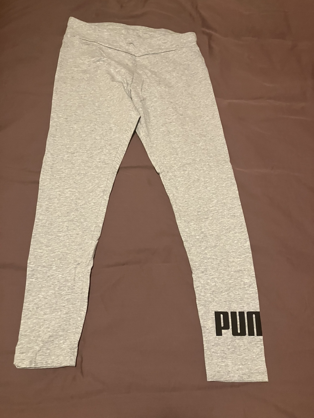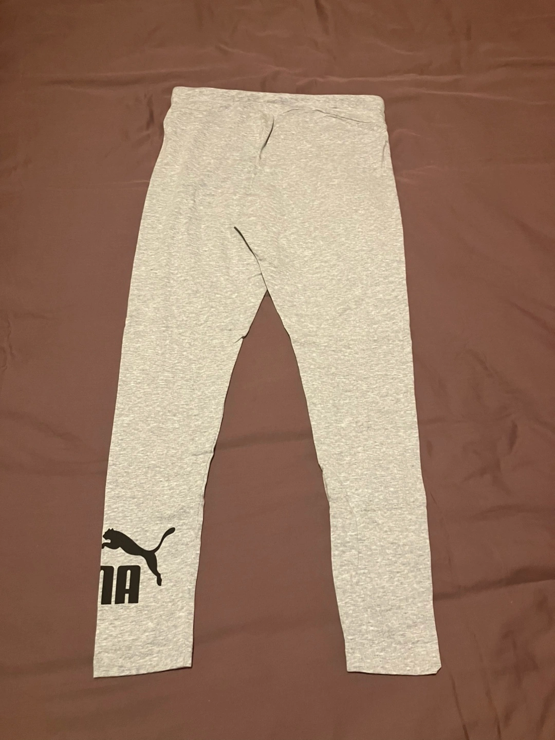 Selling a pair of Puma leggings in heather grey! They're a size medium and feature the Puma logo on the lower leg. Great for workouts or just lounging around