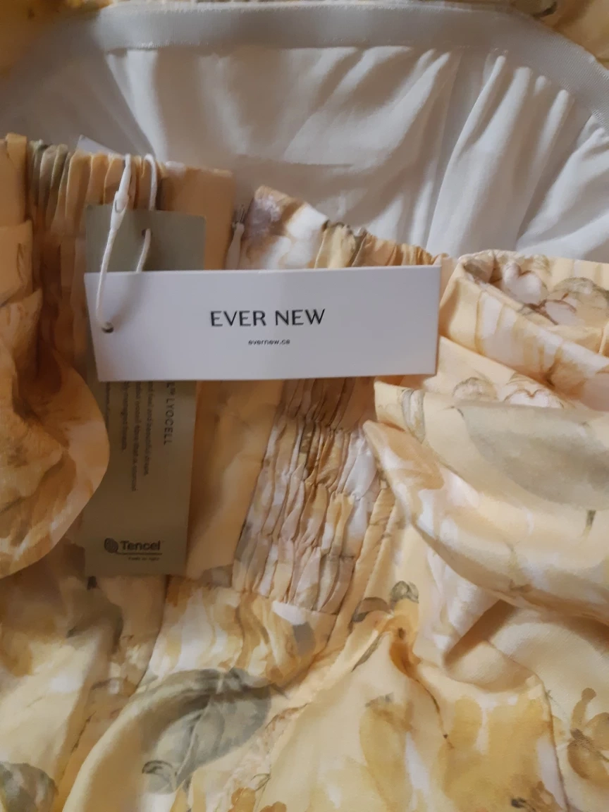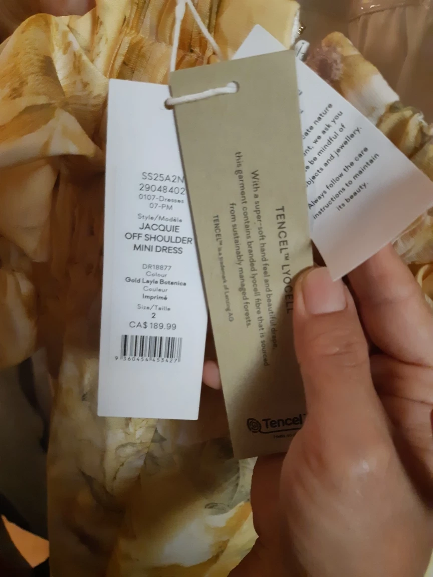 This is a brand new Ever New 'Jacquie' off-shoulder mini dress! It's a size 2 and features a beautiful gold Layla botanic print. The dress is made with Tencel Lyocell, a super-soft and breathable fabric sourced from sustainably managed forests. Originally bought for $189.99 CAD