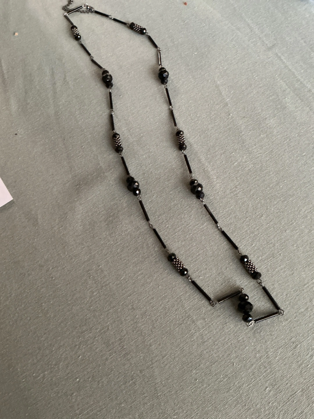 Selling a stylish black beaded necklace. It's in great condition and would be a lovely addition to any outfit! The beads are a mix of round and cylindrical shapes, giving it a unique look