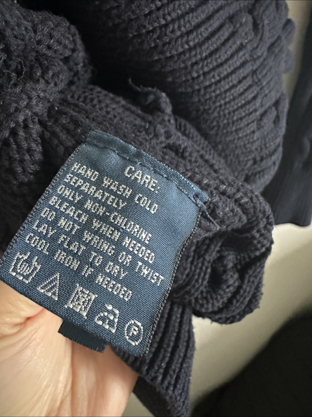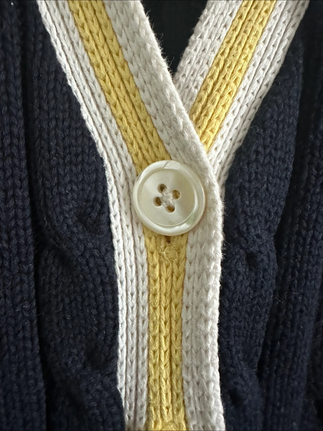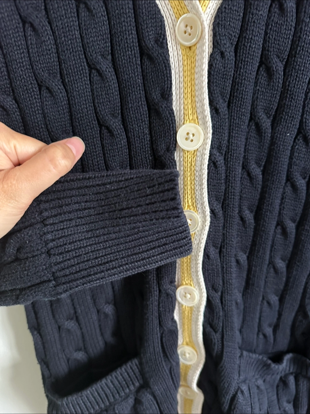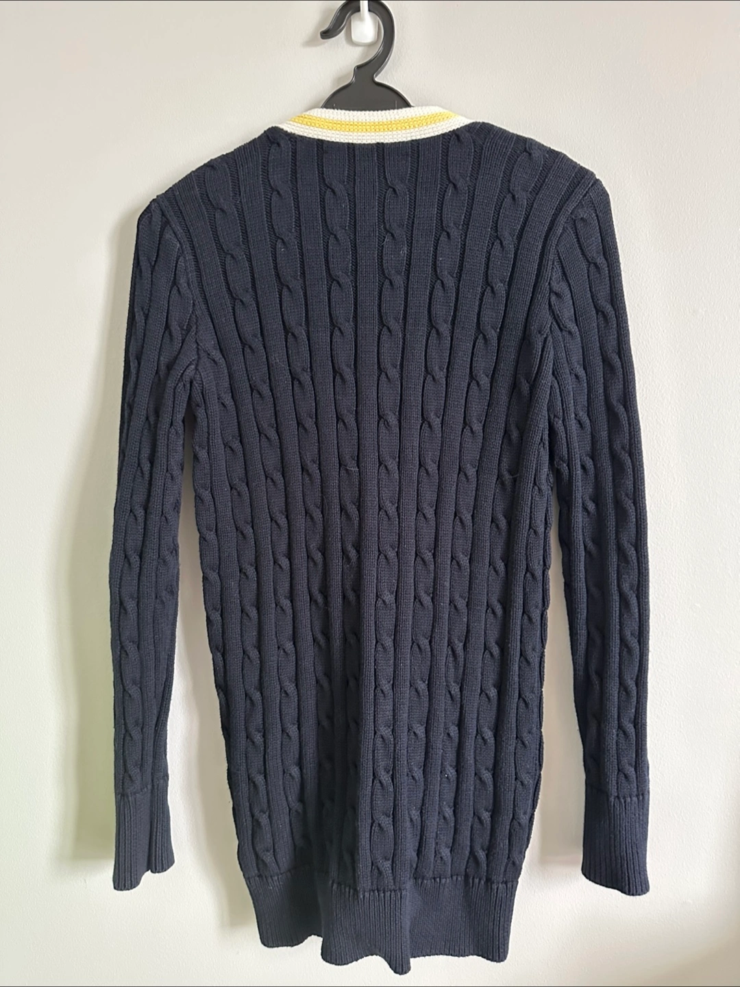 Good condition navy blue ( almost black) cable-knit with white and yellow details along the front. Made of 100% cotton, it's very comfy and perfect for layering