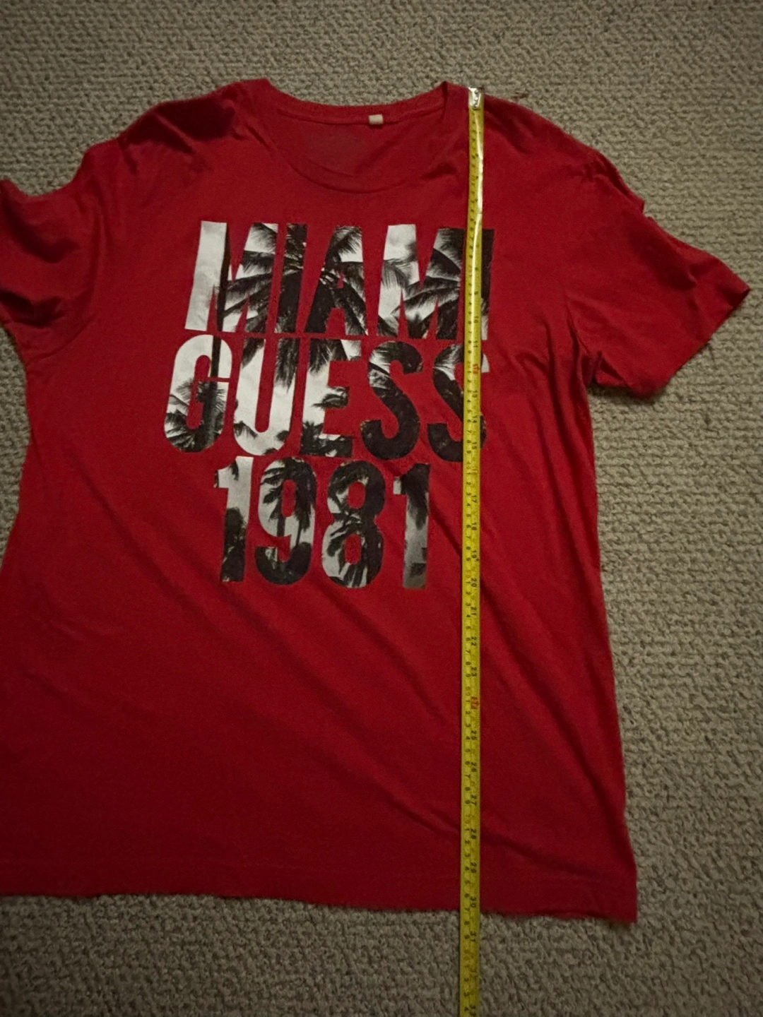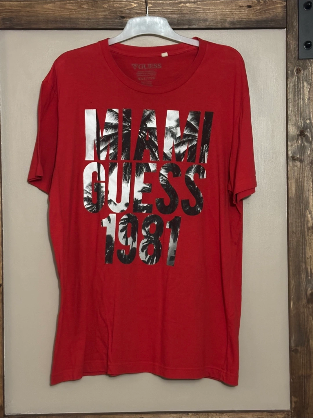 Selling a Guess T-shirt in size XXL. The shirt is red and features a "Miami Guess 1981" design on the front. It's made of 100% cotton.