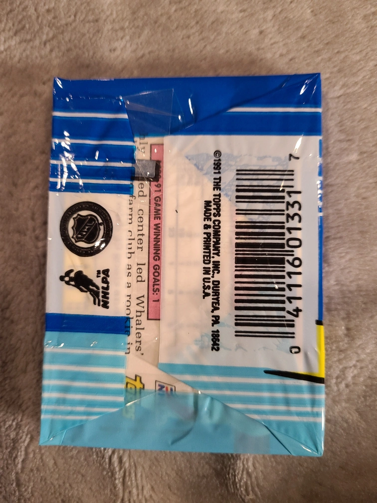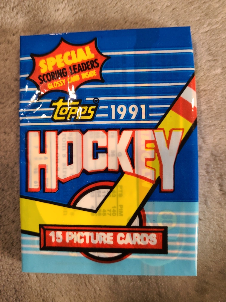 Selling multiple packs of 1991 Topps Hockey cards! This pack includes 13 picture cards and a special scoring leaders glossy card inside. A fun piece of hockey history for collectors. Packs are available!!!!