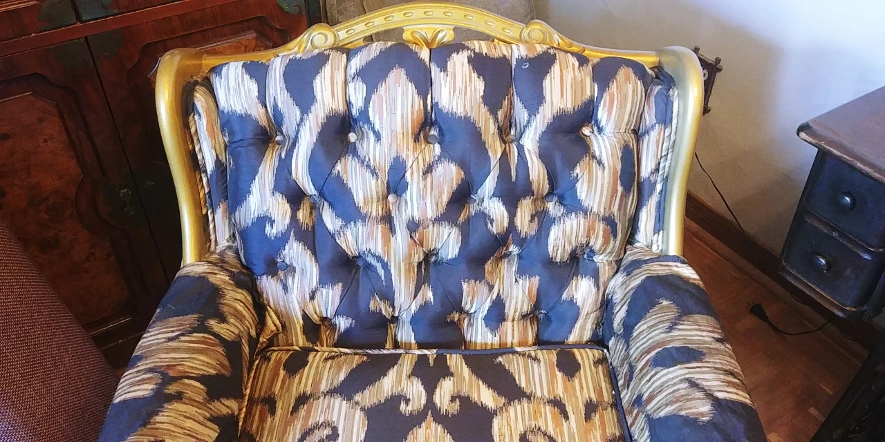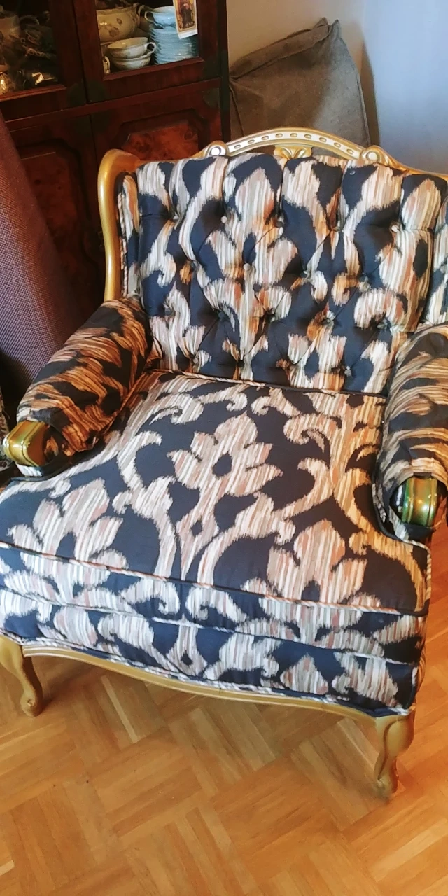 50 yr old french province chair...re upholstered 7 or 8 yrs ago...in good shape....a bit of green spray on the wooden hand rest part