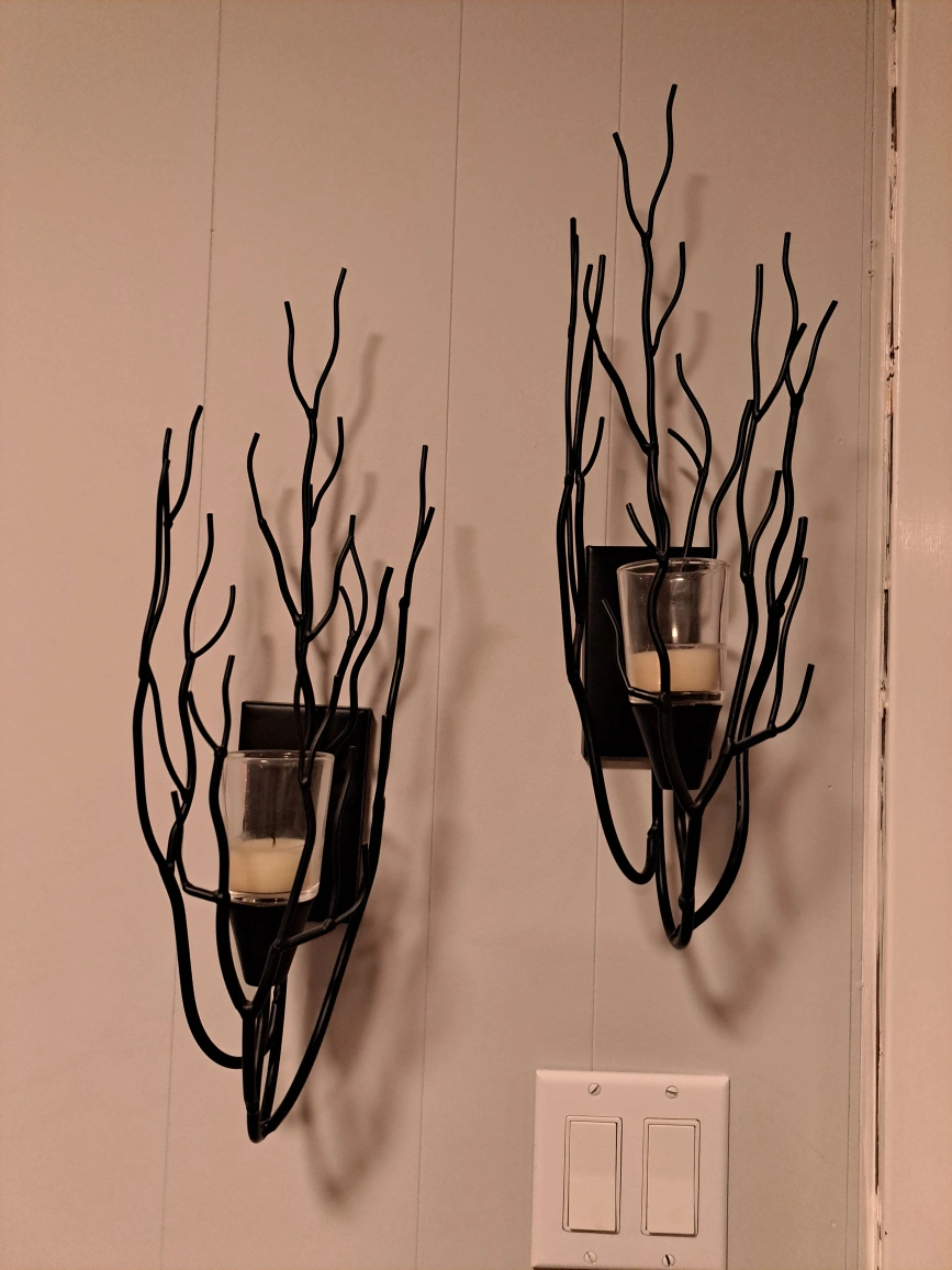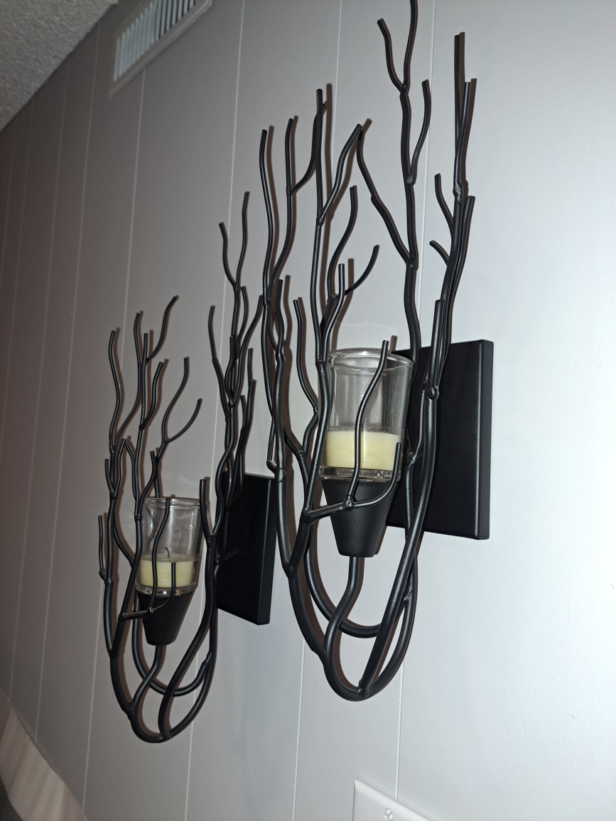 Here's a pair of metal candle wall sconces! They feature a unique branch-like design and would add a touch of rustic charm to any room. Perfect for creating a cozy atmosphere in your home. Candles are included!