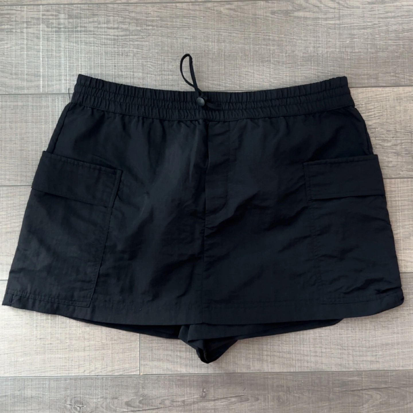 Selling a Zara black cargo mini skort in size L. The skort has an elastic waistband with a drawstring and functional cargo pockets on the sides. Perfect for a casual, trendy look!