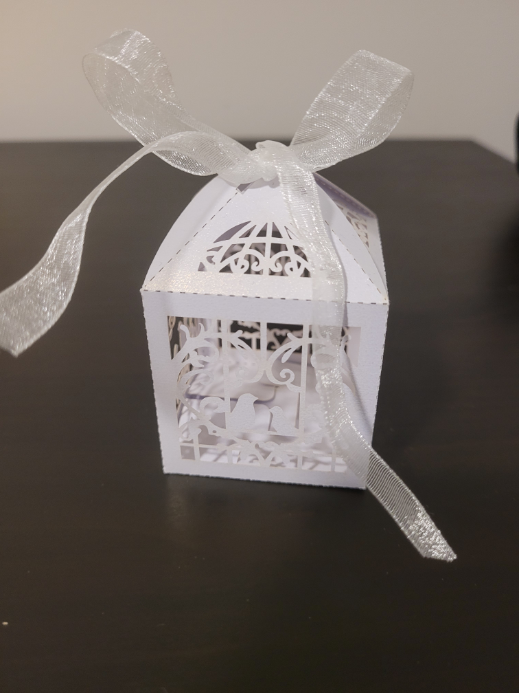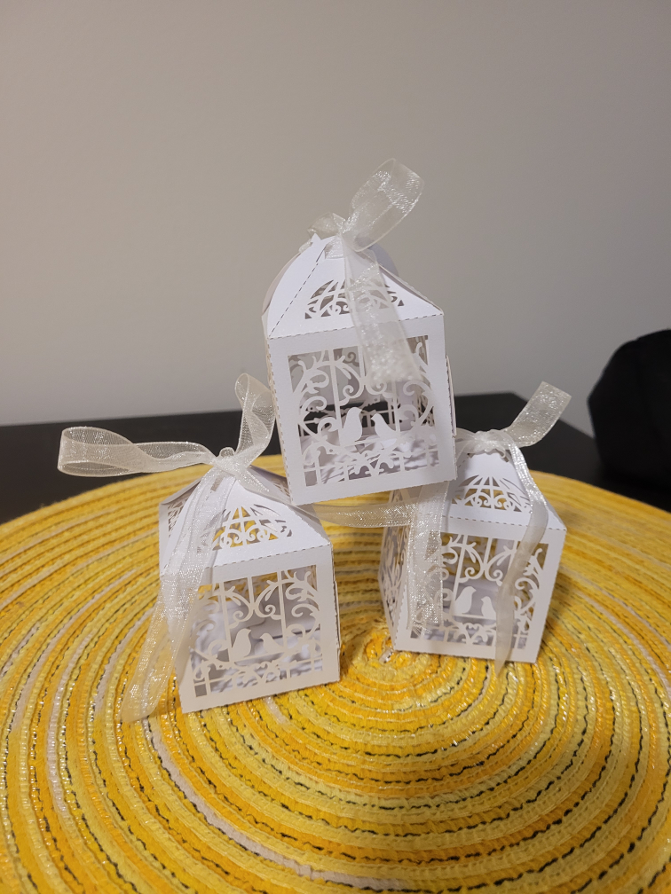 Selling these adorable white birdcage favour boxes, complete with ribbons! They're perfect for weddings, showers, or any special event where you want to add a touch of elegance. All are assembled . Just fill with treats and sweets and these are ready for your special occasion.