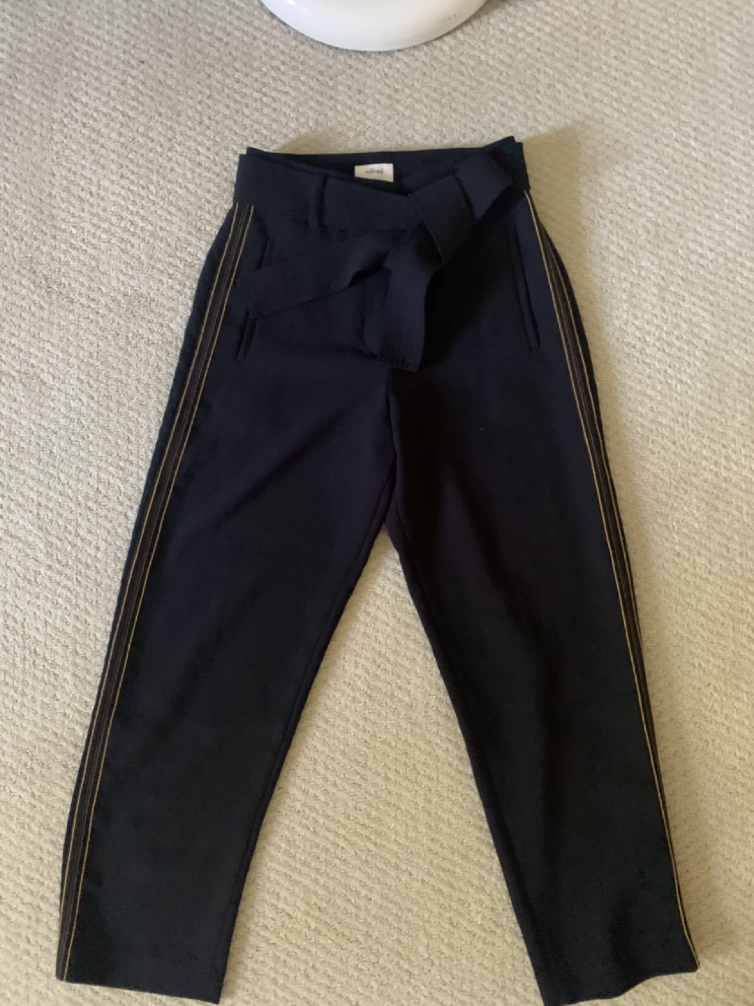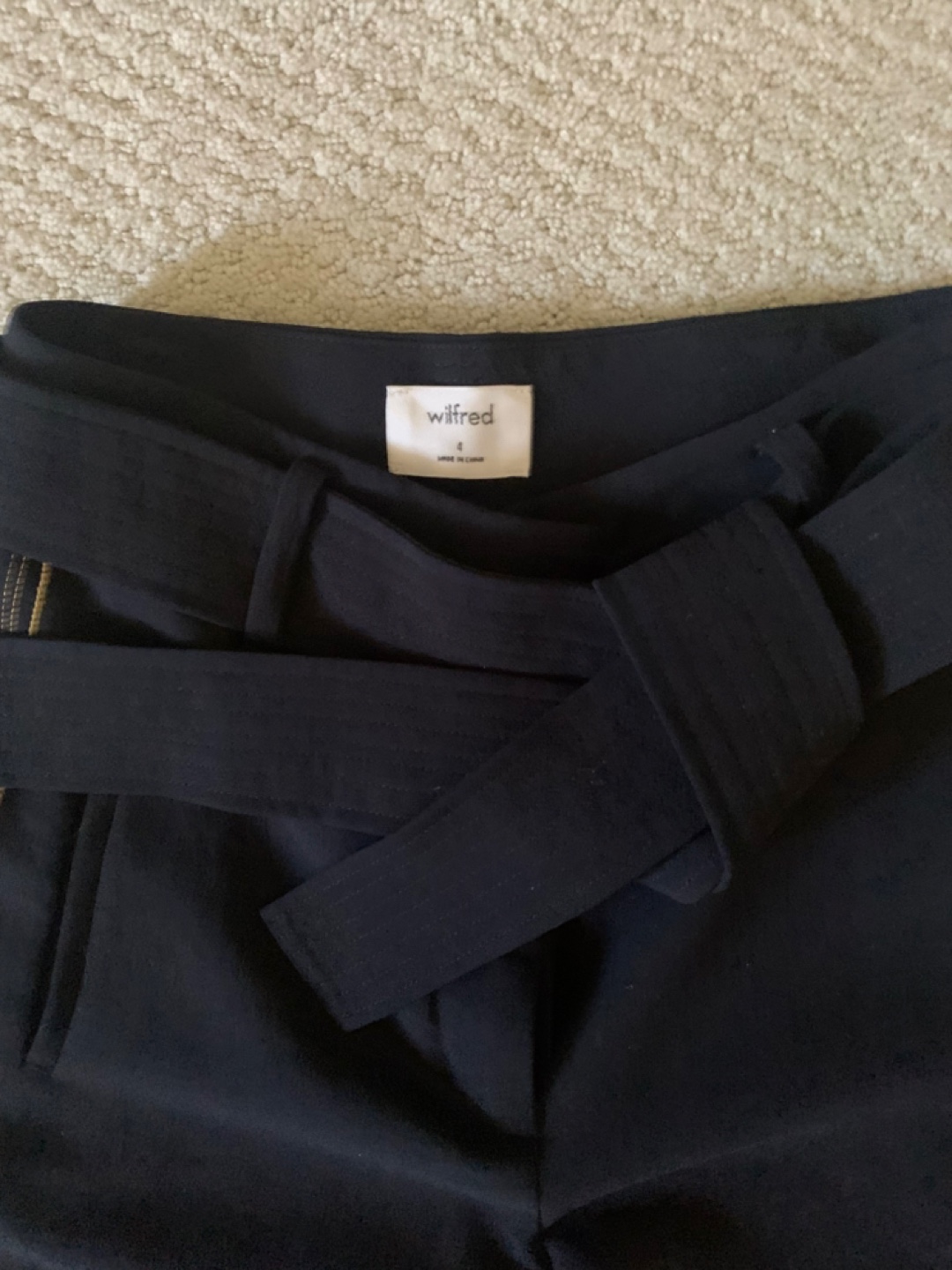 Selling a pair of Wilfred black pants in size 4. They feature a stylish belt and a sleek design. Perfect for any occasion!