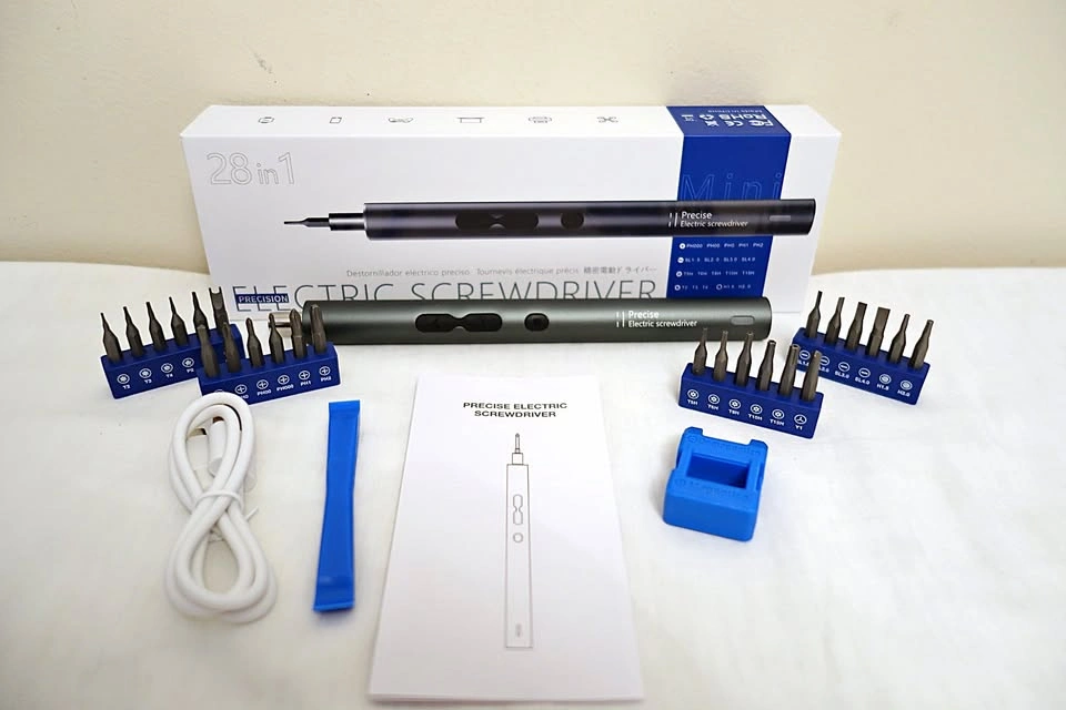 Brand new 28-in-1 rechargeable wireless electric portable screwdriver with built-in LED light. Has dedicated buttons for forward, reverse and activating/deactivating the LED light. Kit includes the screwdriver, 24 different bits, USB-C charging cable, electronics prying tool and magnetizer/demagnetizer. Perfect for use on electronics, jewellery, eyeglasses and small gadgets.