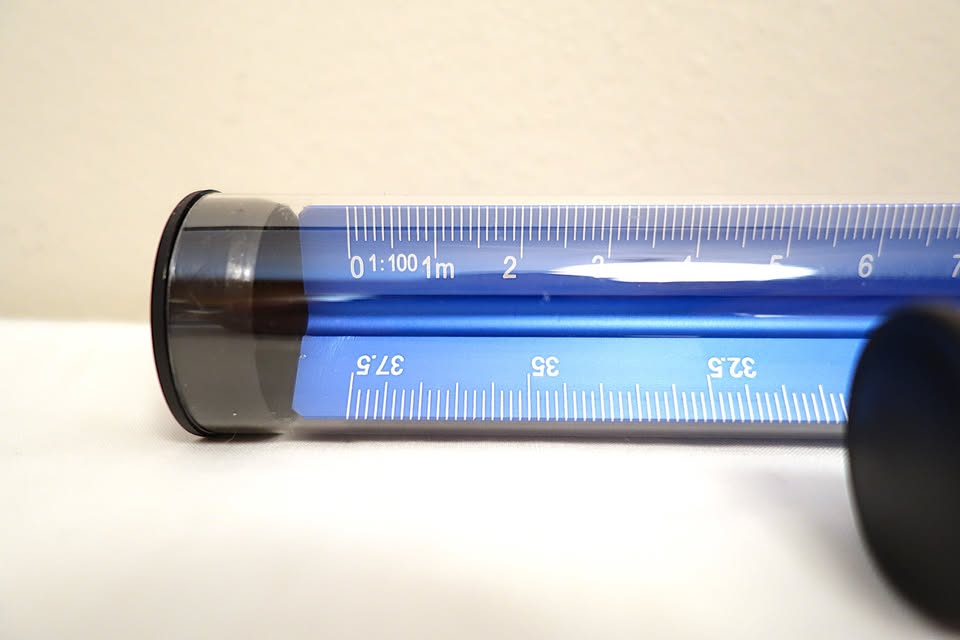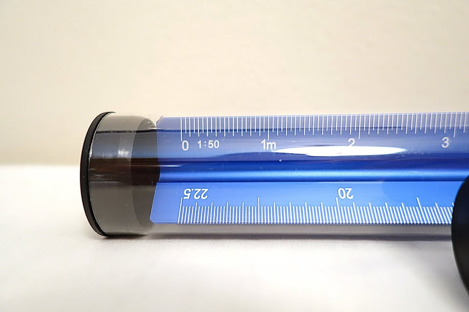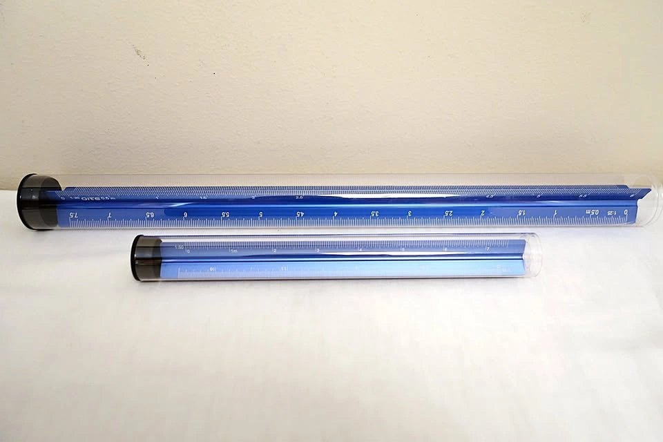 Selling a pair of brand new, blue anodized aluminum triangular scale rulers for architects. The longer of the two rulers measures approximately 12.25" in length, while the smaller one is half the size. Perfect for the practicing architect, or for a student who is entering or currently studying in the field.