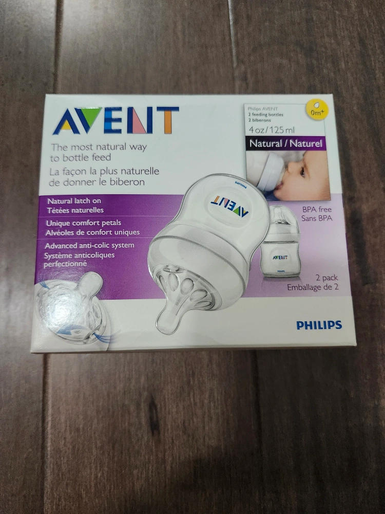 Selling a pack of Philips Avent Natural baby bottles, containing two 4oz/125ml bottles! These are designed to be the most natural way to bottle feed your little one. They feature a natural latch-on nipple, unique comfort petals, and an advanced anti-colic system. Suitable for newborns 0m+.