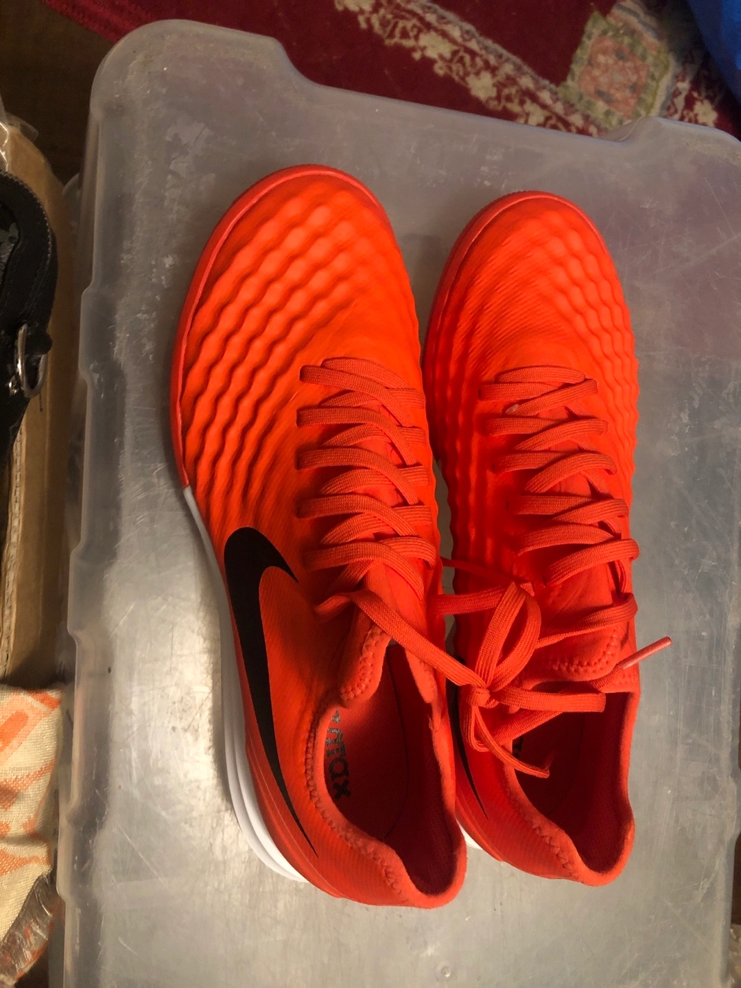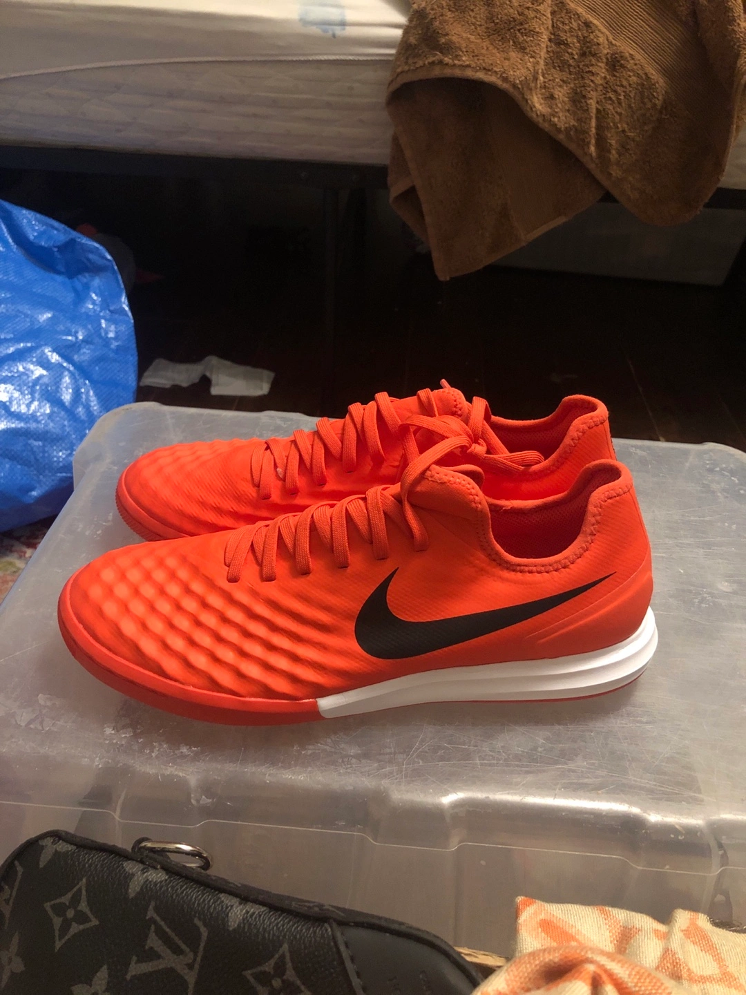 37These Nike MagistaX Finale II IC indoor soccer shoes are in great shape and ready for your next game! They're a vibrant orange colour with the iconic black Nike swoosh. Perfect for indoor play, offering excellent traction and control Size 8