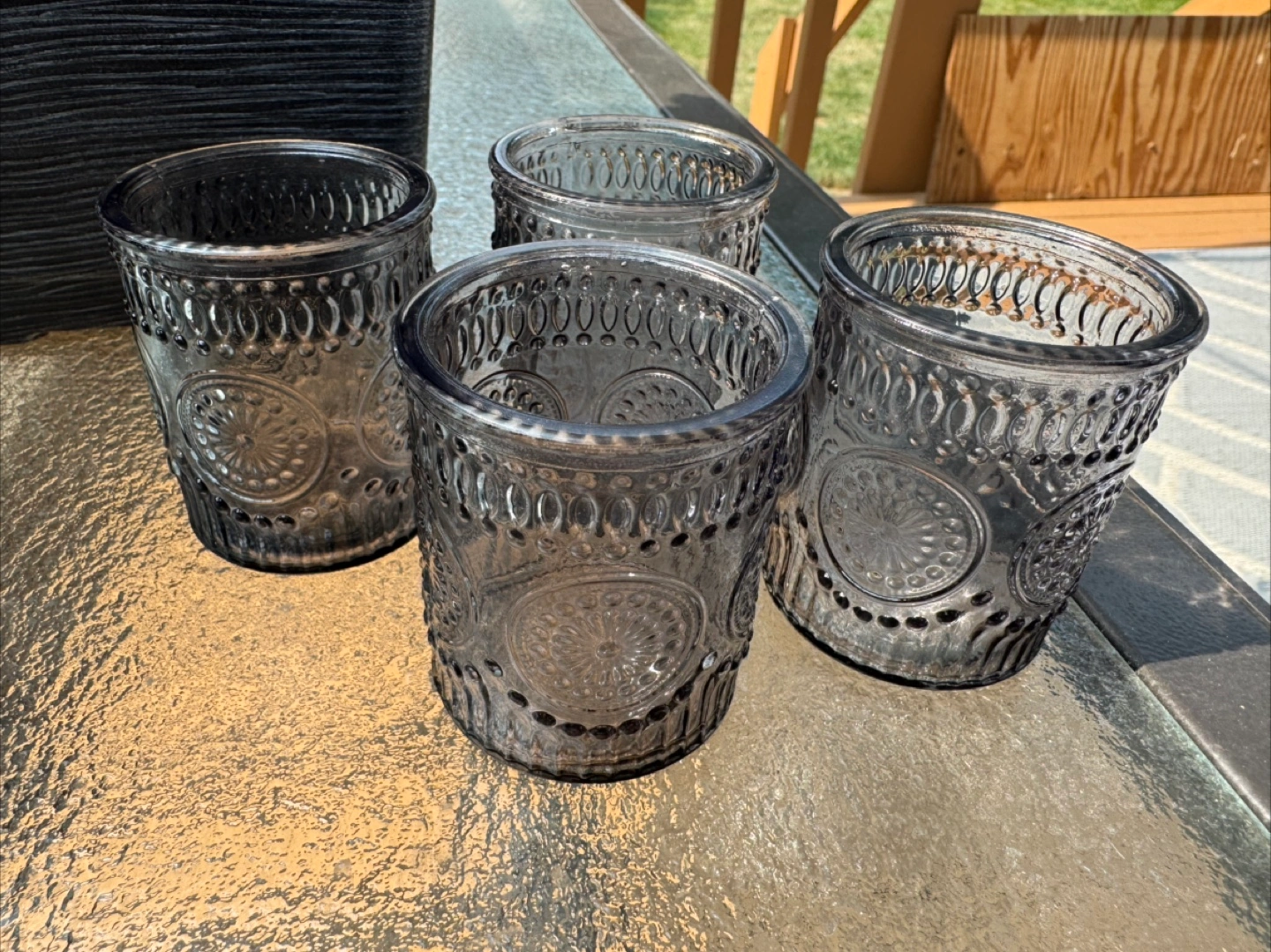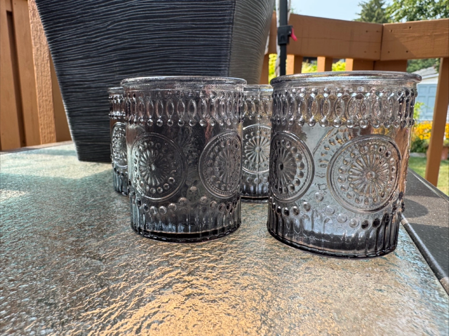 Selling a set dark grey tinted textured glass candle holders. They have a beautiful design and are in great condition. Perfect for adding a touch of elegance to any room! Have 31 pieces. Prefer to sell as a set for $45 Or $1.50 each