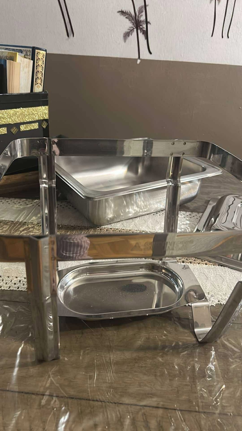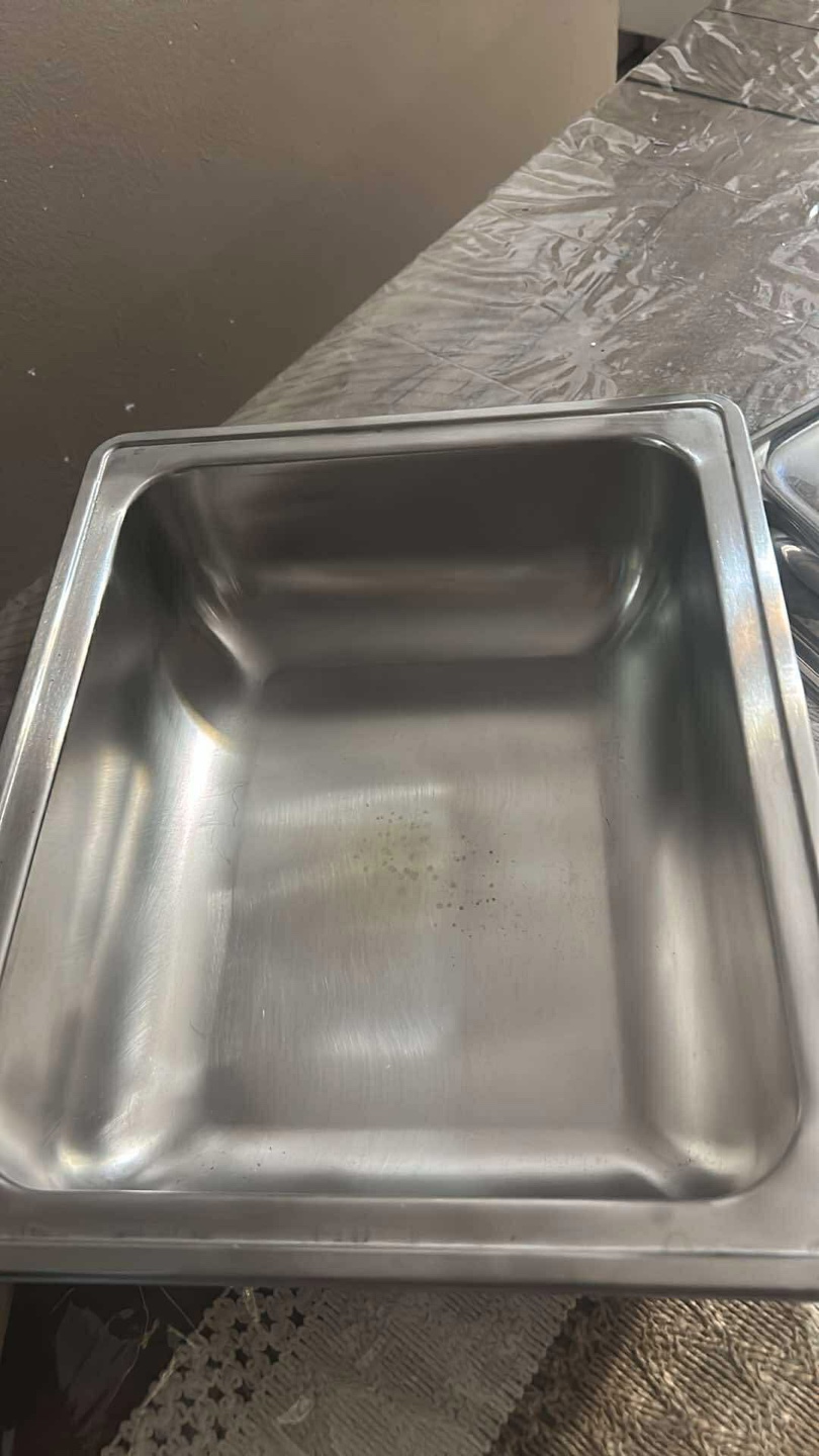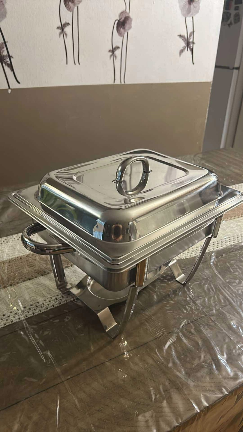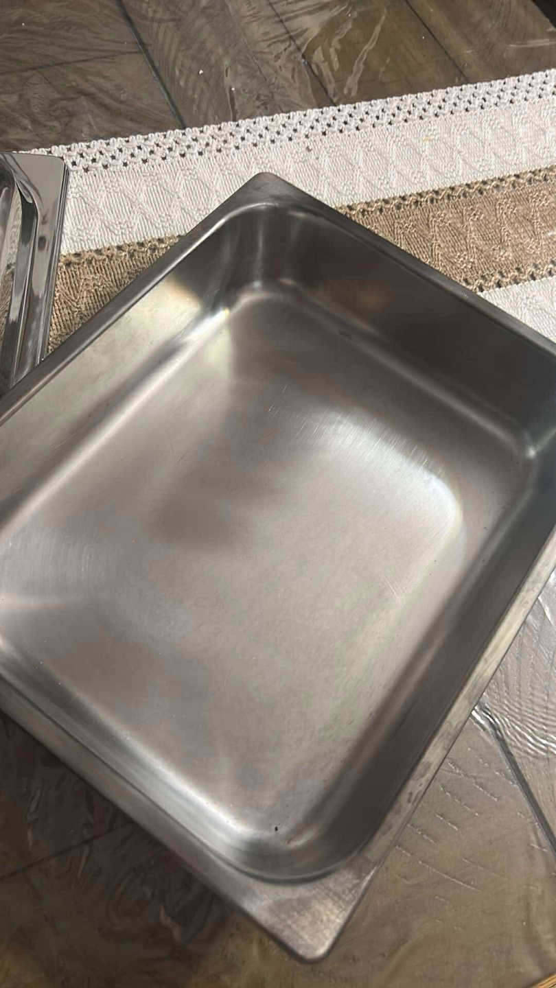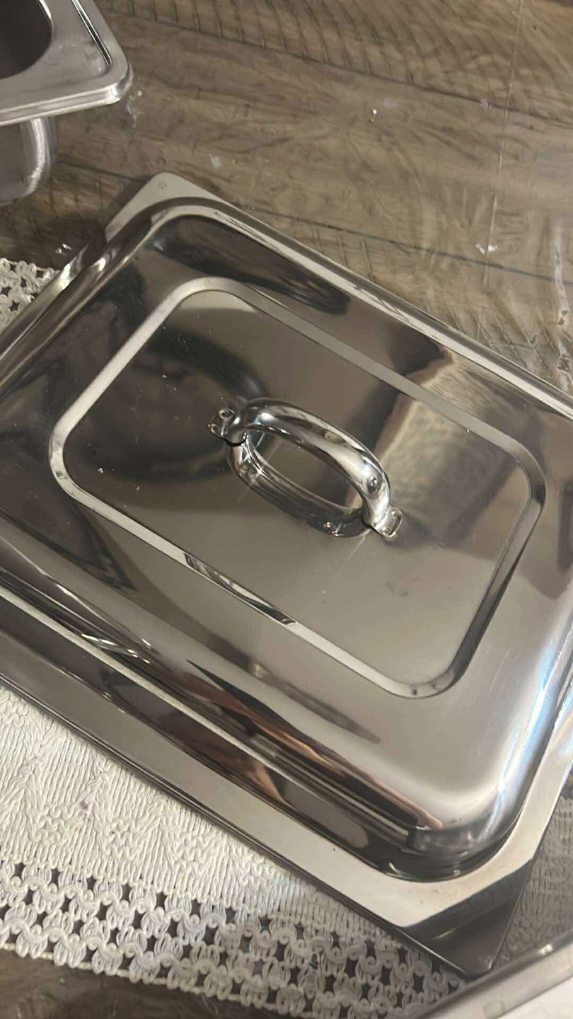 Selling a stainless steel chafing dish. It's perfect for keeping food warm at parties or gatherings. It does show some signs of use.