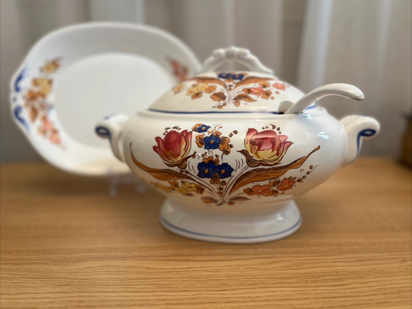 Floral Ceramic Soup Tureen with Ladle and Plate